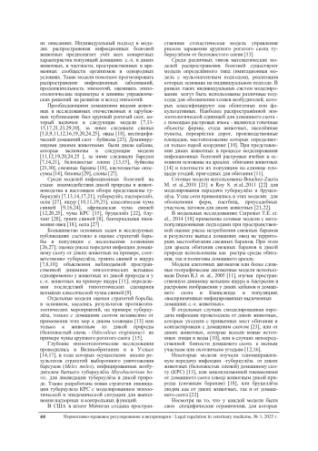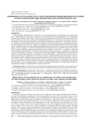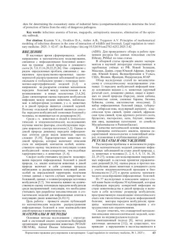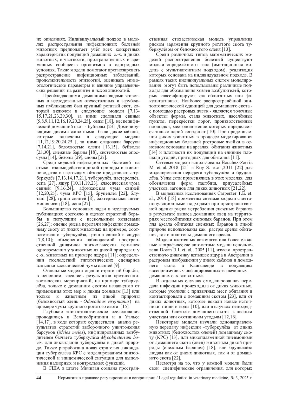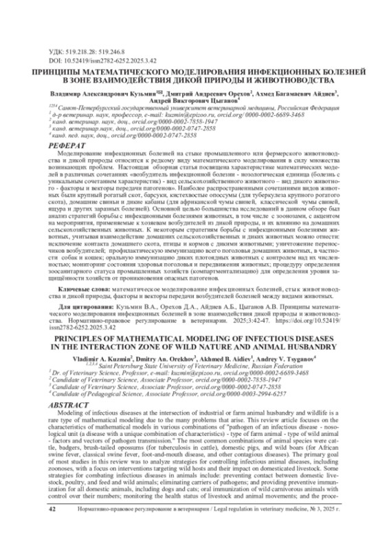 Моделирование инфекционных болезней на стыке промышленного или фермерского животноводства и дикой природы относится к редкому виду математического моделирования в силу множества возникающих проблем. Настоящая обзорная статья посвящена характеристике математических моделей в различных сочетаниях «возбудитель инфекционной болезни - нозологическая единица (болезнь с уникальным сочетанием характеристик) - вид сельскохозяйственного животного - вид дикого животного - факторы и векторы передачи патогенов». Наиболее распространенными сочетаниями видов животных были крупный рогатый скот, барсуки, кистехвостые опоссумы (для туберкулеза крупного рогатого скота), домашние свиньи и дикие кабаны (для африканской чумы свиней, классической чумы свиней, ящура и других заразных болезней). Основной целью большинства исследований в данном обзоре был анализ стратегий борьбы с инфекционными болезнями животных, в том числе с зоонозами, с акцентом на мероприятия, применяемые к хозяевам возбудителей из дикой природы, и их влиянию на домашних сельскохозяйственных животных. К некоторым стратегиям борьбы с инфекционными болезнями животных, учитывая взаимодействие домашних сельскохозяйственных и диких животных можно отнести: исключение контакта домашнего скота, птицы и кормов с дикими животными; уничтожение переносчиков возбудителей; профилактическую иммунизацию всего поголовья домашних животных, в частности собак и кошек; оральную иммунизацию диких плотоядных животных с контролем над их численностью; мониторинг состояния здоровья поголовья и передвижения животных; процедуру определения зоосанитарного статуса промышленных хозяйств (компартментализацию) для определения уровня защищённости хозяйств от проникновения опасных патогенов.