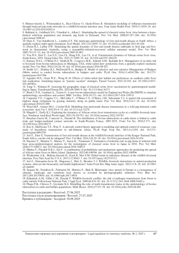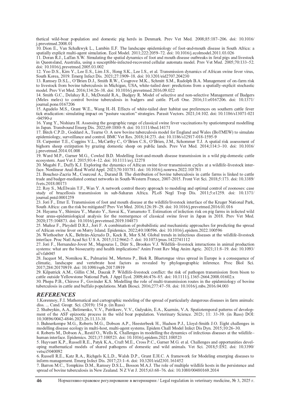 2. Шабейкин А.А., Белименко В.В., Патрикеев В.В., Гулюкин Е.А., Кузьмин В.А. Пространственно-временные закономерности развития эпизоотического процесса АЧС в популяции кабанов. Ветеринария. 2023;11:33-39. DOI: 10.30896/0042-4846.2023.26.11.33-38