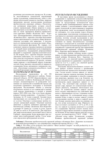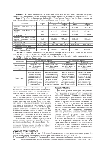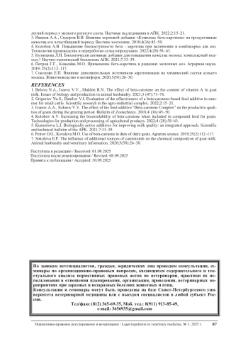1. Белова Н.А., Исаева В.В., Мухин Р.Н. Влияние бета - каротина на содержание витаминов группы А в молоке коз. Вопросы биологии и производства в животноводстве. 2021;3(47):71-76.