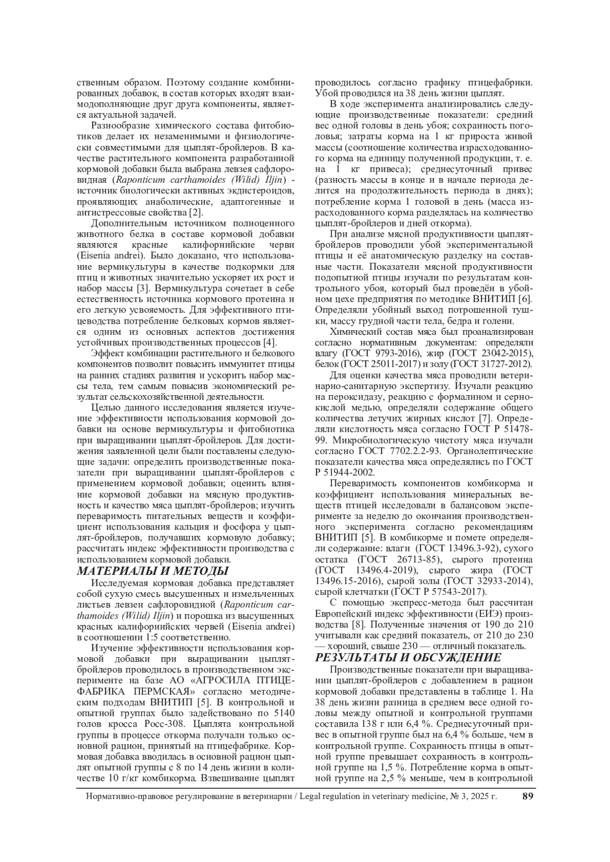 В статье приведены результаты изучения эффективности использования кормовой добавки на основе вермикультуры и фитобиотика при выращивании цыплят-бройлеров. Кормовая добавка вводилась в основной рацион цыплят с 8 по 14 день жизни в количестве 10 г/кг комбикорма. Установлено, что кормовая добавка положительно влияет на производственные показатели, увеличивая среднесуточный привес и сохранность птицы, при этом уменьшая потребление корма. Кормовая добавка увеличивает содержание сухого вещества и белка в мышцах цыплят-бройлеров и улучшает показатели переваримости питательных веществ. Использование кормовой добавки обеспечивает рост европейского индекса эффективности производства.