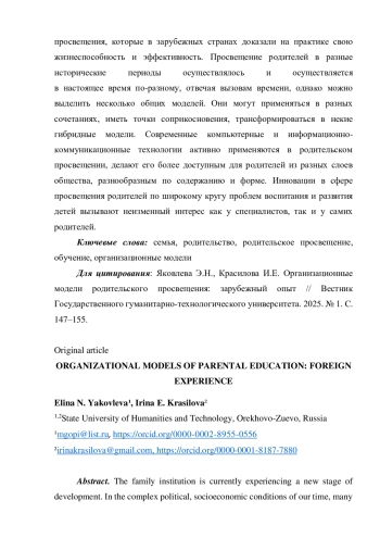 1. Данилова И.С., Орехова Е.Я. Семья и школа за рубежом: история, теория, практика. Тула: ООО “ТППО”, 2019. 190 с. EDN: VFHAQH