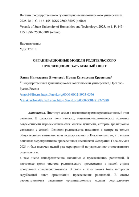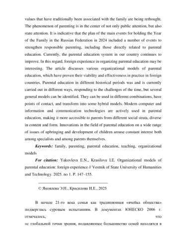 Институт семьи в настоящее время переживает новый этап развития. В сложных политических, социально-экономических условиях современности переосмысливаются многие ценности, которые традиционно связывали с семьей. Феномен родительства находится в центре не только общественного внимания, но и государственного. Показательно то, что в план основных мероприятий по проведению в Российской Федерации Года семьи в 2024 г. был включен целый ряд мероприятий по укреплению ответственного родительства, в том числе непосредственно связанные с просвещением родителей. В настоящее время система родительского просвещения в нашей стране продолжает совершенствоваться. В связи с этим может быть интересен зарубежный опыт организации просвещения родителей. В статье рассматриваются различные организационные модели родительского просвещения, которые в зарубежных странах доказали на практике свою жизнеспособность и эффективность. Просвещение родителей в разные исторические периоды осуществлялось и осуществляется в настоящее время по-разному, отвечая вызовам времени, однако можно выделить несколько общих моделей. Они могут применяться в разных сочетаниях, иметь точки соприкосновения, трансформироваться в некие гибридные модели. Современные компьютерные и информационно-коммуникационные технологии активно применяются в родительском просвещении, делают его более доступным для родителей из разных слоев общества, разнообразным по содержанию и форме. Инновации в сфере просвещения родителей по широкому кругу проблем воспитания и развития детей вызывают неизменный интерес как у специалистов, так и у самих родителей.