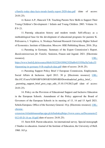 13. Parenting Support Policy Brief / European Commission, Employment, Social Affairs & Inclusion. April 2013. 30 p. [Electronic resource]. URL: file://C:/Users/%D0%BF%D0%B5%D0%BD/Downloads/eaf_policy_brief_-_parenting_support_brief_post_copy_edit_15.10.13%20(2).pdf (date of access: 24.01.25).
