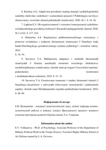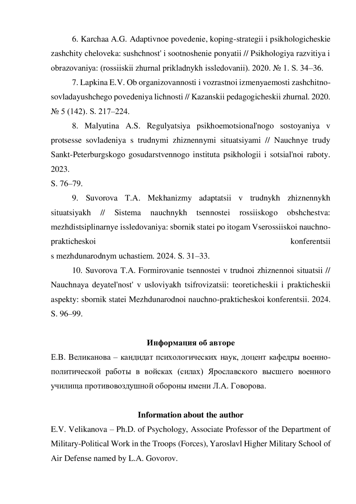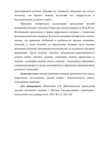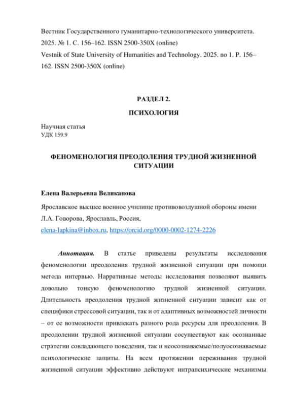 ВЕЛИКАНОВА Е. В. ФЕНОМЕНОЛОГИЯ ПРЕОДОЛЕНИЯ ТРУДНОЙ ЖИЗНЕННОЙ СИТУАЦИИ // ВЕСТНИК ГОСУДАРСТВЕННОГО ГУМАНИТАРНО-ТЕХНОЛОГИЧЕСКОГО УНИВЕРСИТЕТА. 2025. № 1
