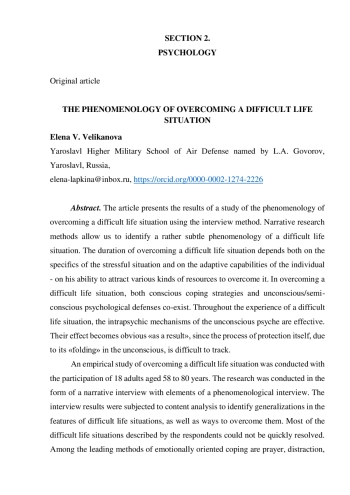 В статье приведены результаты исследования феноменологии преодоления трудной жизненной ситуации при помощи метода интервью. Нарративные методы исследования позволяют выявить довольно тонкую феноменологию трудной жизненной ситуации. Длительность преодоления трудной жизненной ситуации зависит как от специфики стрессовой ситуации, так и от адаптивных возможностей личности - от ее возможности привлекать разного рода ресурсы для преодоления. В преодолении трудной жизненной ситуации сосуществуют как осознанные стратегии совладающего поведения, так и неосознаваемые/полуосознаваемые психологические защиты. На всем протяжении переживания трудной жизненной ситуации эффективно действуют интрапсихические механизмы неосознаваемой психики. Действие их становится очевидным «по итогу», поскольку сам процесс защиты, вследствие его «свернутости» в бессознательном, отследить сложно. Проведено эмпирическое исследование преодоления трудной жизненной ситуации с участием 18 взрослых людей в возрасте от 58 до 80 лет. Исследование проводилось в форме нарративного интервью с элементами феноменологического интервью. Результаты интервью подвергались контент-анализу для выявления обобщений в особенностях трудных жизненных ситуаций, а также способов их преодоления. Большая часть трудных жизненных ситуаций, описываемых респондентами, не поддавалась быстрому разрешению. Среди ведущих способов эмоционально-ориентированного копинга можно отметить: молитву, отвлечение, занятия творчеством (у женщин - кулинарию, вязание, шитье; у мужчин - электронику), обращение к социальному ресурсу (с целью «выговориться»), обращение к прежнему опыту успешного совладания.