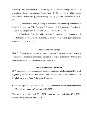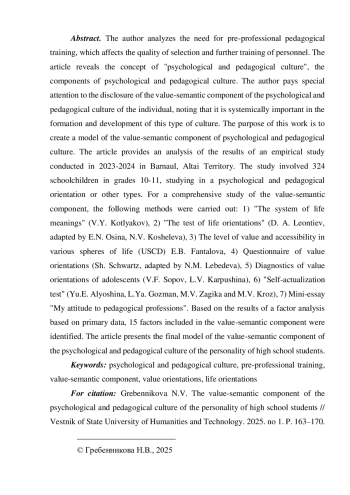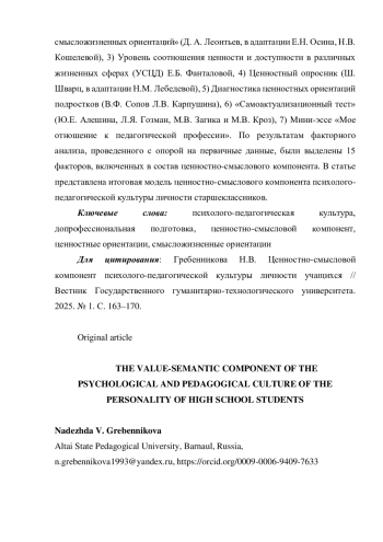 ГРЕБЕННИКОВА Н. В. ЦЕННОСТНО-СМЫСЛОВОЙ КОМПОНЕНТ ПСИХОЛОГО-ПЕДАГОГИЧЕСКОЙ КУЛЬТУРЫ ЛИЧНОСТИ УЧАЩИХСЯ // ВЕСТНИК ГОСУДАРСТВЕННОГО ГУМАНИТАРНО-ТЕХНОЛОГИЧЕСКОГО УНИВЕРСИТЕТА. 2025. № 1