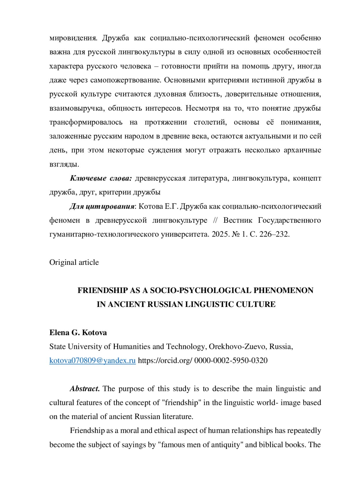 Цель данного исследования состоит в описании основных лингвокультурологических особенностей концепта «дружба» в языковой картине мира на материале древнерусской литературы. Дружба как морально-этический аспект человеческих взаимоотношений неоднократно становилась темой изречений «знаменитых мужей древности» и библейских книг. В паремиях как ценностно-маркированных высказываниях, отражающих поведенческие доминанты нации в целом, тема дружбы также активно развивалась. Именно в них часто повторяется мысль о преданности и взаимовыручке друзей, оказавшихся в трудных жизненных ситуациях, а также о предпочтении старого друга новому. В пословицах, поговорках и изречениях, как показало настоящее исследование, очень чётко сформулировано морально-этическое отношение членов социума к дружбе, в них находят своё отражение нравственные нормы и стереотипы поведения, фиксируются особенности этнического мировидения. Дружба как социально-психологический феномен особенно важна для русской лингвокультуры в силу одной из основных особенностей характера русского человека - готовности прийти на помощь другу, иногда даже через самопожертвование. Основными критериями истинной дружбы в русской культуре считаются духовная близость, доверительные отношения, взаимовыручка, общность интересов. Несмотря на то, что понятие дружбы трансформировалось на протяжении столетий, основы её понимания, заложенные русским народом в древние века, остаются актуальными и по сей день, при этом некоторые суждения могут отражать несколько архаичные взгляды.