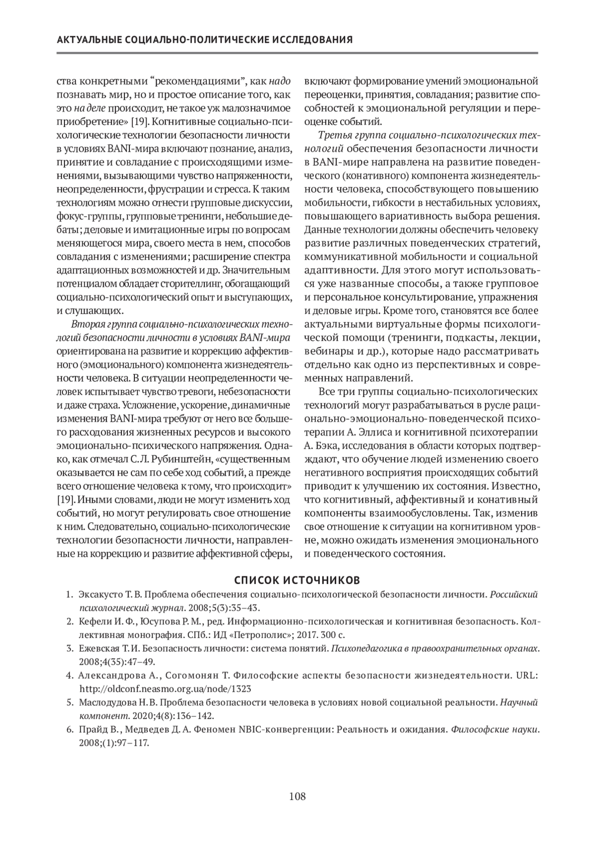 Целью данной статьи является актуализация вопроса социально-психологических технологий безопасности личности в BANI-мире. Для этого надо решить следующие задачи: определить сущность BANI-мира, доказать целесообразность социально-психологической безопасности и уточнить содержание социально-психологических технологий, определить их роль в обеспечении безопасности личности в BANI-мире. Для проведения исследования применялись методы анализа и контент-анализа публикаций междисциплинарного характера по данной проблеме, результатов научных исследований, современной печати; методы систематизации, экстраполяции, проектирования и моделирования, теоретического обобщения. Содержание и классификация социально-психологических технологий безопасности личности в условиях BANI-мира опираются на теории и концепции социального взаимодействия, в которое имманентно включен человек; на положения субъектно-деятельностного подхода; концепции конструкционизма и психологии познания в современной социальной психологии. В статье анализируются социально-психологические технологии трех групп с позиции репрезентации безопасности на трех уровнях (когнитивном, аффективном и конативном). В качестве перспективного направления рассматриваются возможности информационно-коммуникационных технологий для оказания социально-психологической помощи.