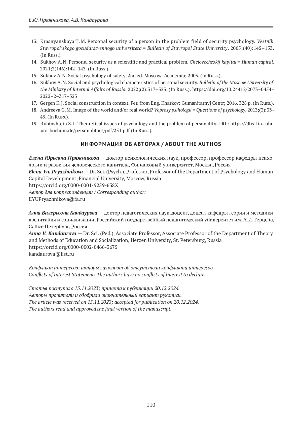 1. Эксакусто Т. В. Проблема обеспечения социально-психологической безопасности личности. Российский психологический журнал. 2008;5(3):35-43.