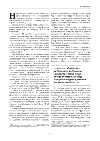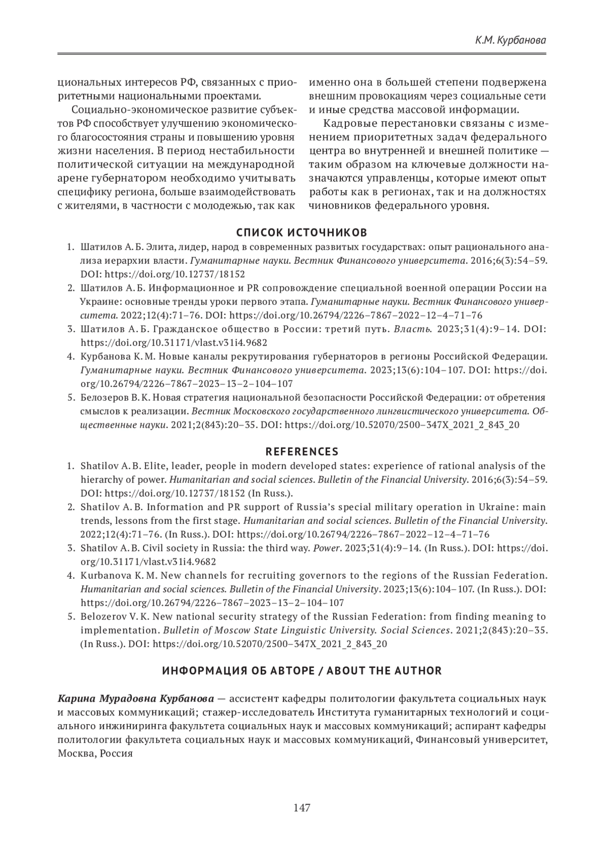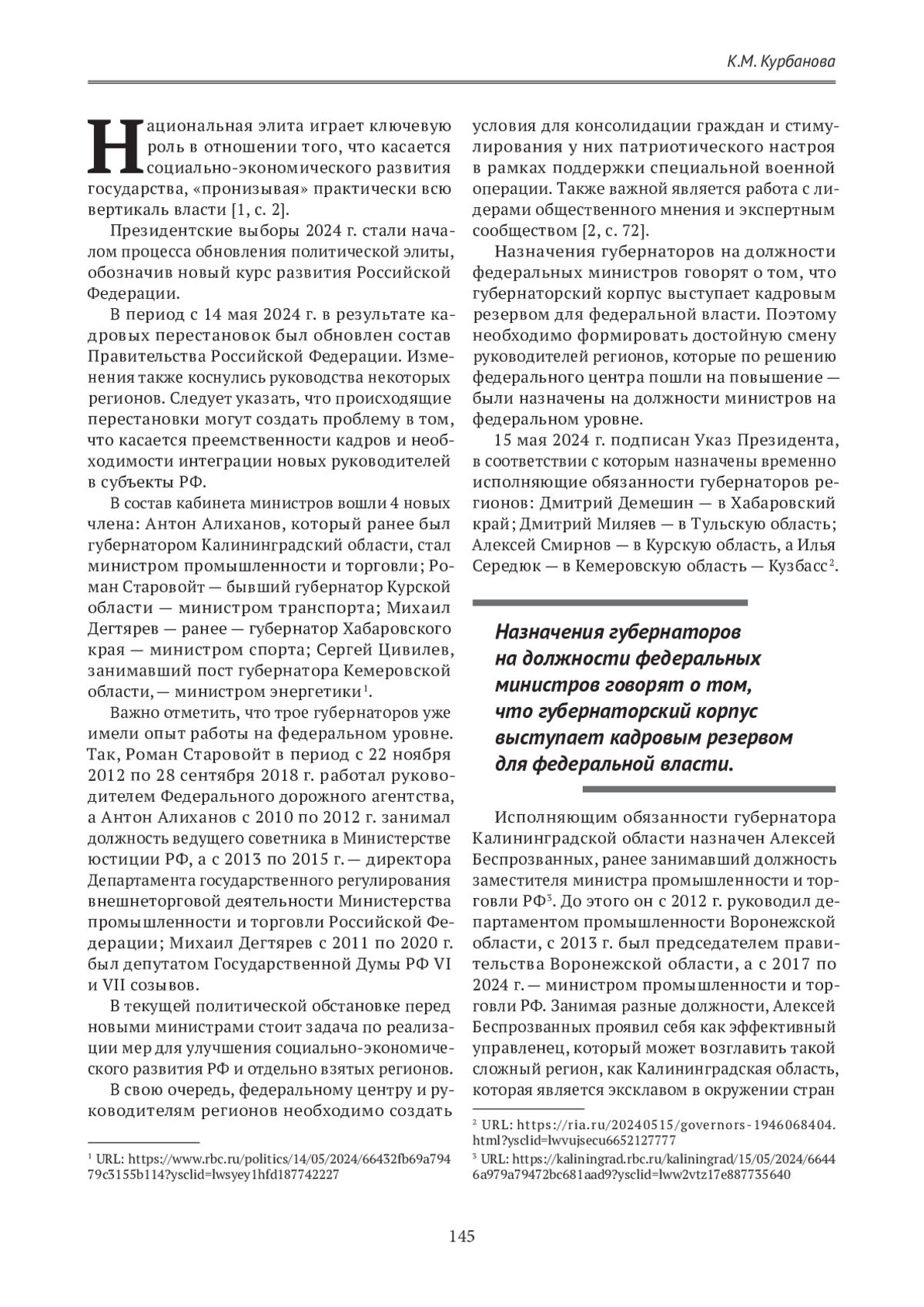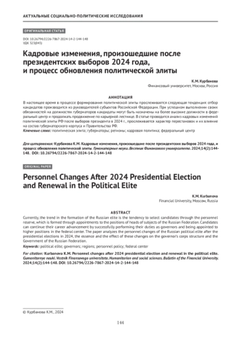 КУРБАНОВА К. М. КАДРОВЫЕ ИЗМЕНЕНИЯ, ПРОИЗОШЕДШИЕ ПОСЛЕ ПРЕЗИДЕНТСКИХ ВЫБОРОВ 2024 ГОДА, И ПРОЦЕСС ОБНОВЛЕНИЯ ПОЛИТИЧЕСКОЙ ЭЛИТЫ // ГУМАНИТАРНЫЕ НАУКИ. ВЕСТНИК ФИНАНСОВОГО УНИВЕРСИТЕТА. 2024. ТОМ 14, № 2