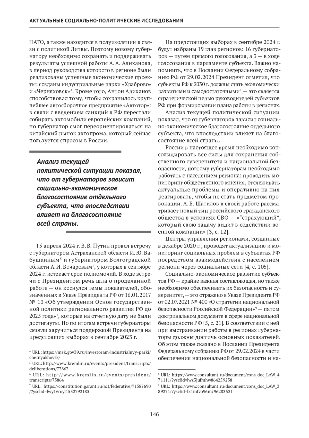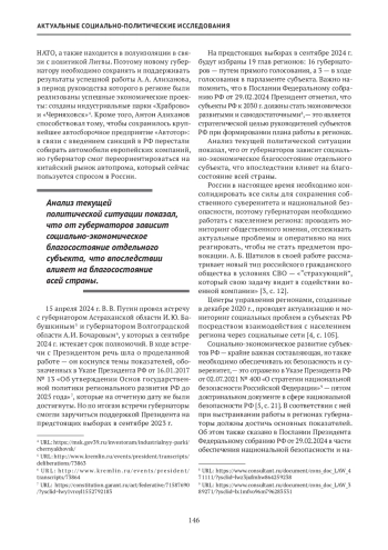 В настоящее время в процессе формирования политической элиты прослеживается следующая тенденция: отбор кандидатов производится из руководителей субъектов Российской Федерации. При успешном выполнении своих обязанностей на должностях губернаторов кандидаты могут быть назначены на более высокие должности в федеральный центр и продолжать продвижение по карьерной лестнице. В статье проводится анализ кадровых изменений политической элиты РФ после выборов президента в 2024 г., прослеживается характер перестановок и их влияние на состав губернаторского корпуса и Правительства РФ.