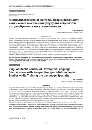 В статье рассматриваются цели обучения языку специальности, а также роль и функции контроля при их реализации. Анализируются условия, нужные для качественного проведения контроля учебных достижений в ходе освоения дисциплины «Иностранный язык в профессиональной сфере» студентами бакалавриата по направлению подготовки «Социология». Доказывается необходимость модернизации методов контроля, при помощи которых можно не только проверять у студентов уровень сформированности различных компетенций, согласно ФГОС ВО, но одновременно с этим развивать у них навыки критического и креативного мышления. Предлагаются рекомендации по взаимодействию со специалистами профильных кафедр и приглашенными лекторами из реального сектора экономики, а также по организации дополнительной профессиональной подготовки для преподавателей, которые обучают будущих социологов языку специальности.