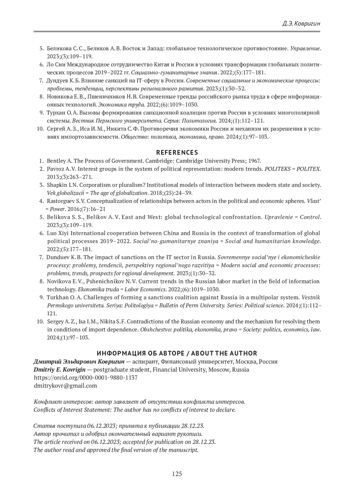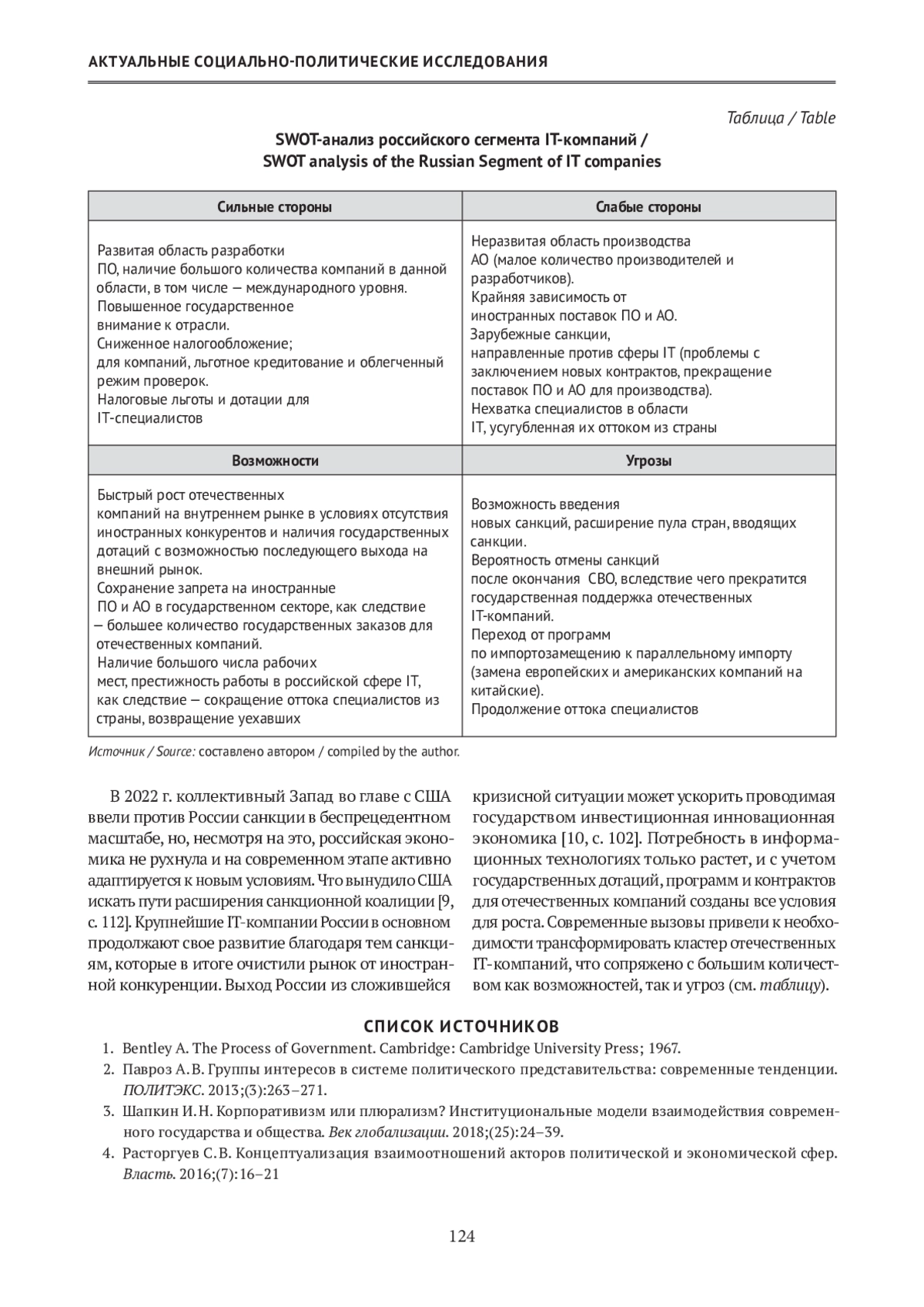 Целью данной статьи является изучение состояния наиболее крупных отечественных IT-компаний в условиях санкций. Автором рассмотрены топ-100 компаний из рейтинга TAdviser за 2023 г. Выявлены диспропорции между производителями аппаратного обеспечения (АО) и программного обеспечения (ПО). Рассмотрены общие проблемы экономики, вызванные санкциями, а также то, как государство стремится их нивелировать посредством дотаций и налоговых послаблений для компаний и сотрудников. На основе полученных данных проведен SWOT-анализ IT-сферы экономики Российской Федерации. Выявлено, что санкции наиболее сильно ударили именно по иностранным компаниям, действующим на российском рынке, что дает отечественным разработчикам возможности для активного роста. Повышенное внимание к отечественным IT-компаниям также связано с необходимостью замены иностранного оборудования и программ, используемых на современном этапе органами государственной власти и системообразующими предприятиями Российской Федерации. Данные факторы выступают причиной повышения активности взаимодействия органов государственной власти нашей страны и IT-предприятий.
