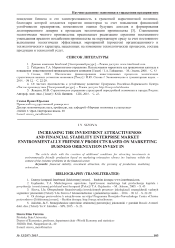 3. Сизова, И.Ю. Обеспечение финансирования инвестиционных процессов экологизации стратегически важных сегментов экономики [Текст] / И.Ю. Сизова // Экономические и гуманитарные науки. - 2014. - № 12. - С. 22-29. EDN: TCXGCR