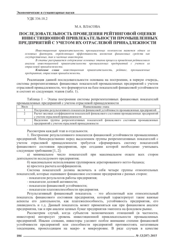 Реализация данной последовательности основана на построении, в первую очередь, системы репрезентативных финансовых показателей промышленных предприятий с учетом отраслевой принадлежности, что формируется на базе показателей финансовой устойчивости и состоит из следующих этапов (табл. 1).