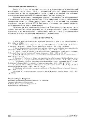 1. Bena, J. Ownership and International Mergers and Acquisitions / J. Bena, K. Li // Journal of Business. - 2013 - №28. - p. 185-200.
