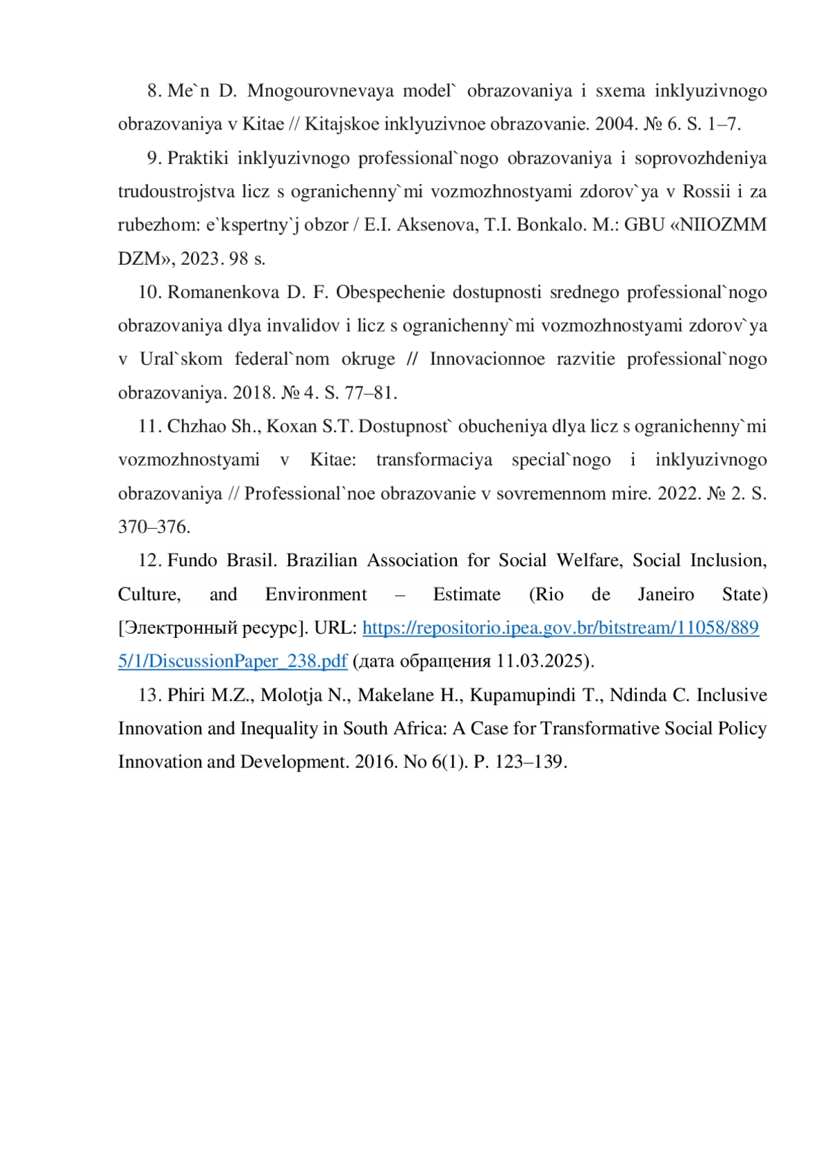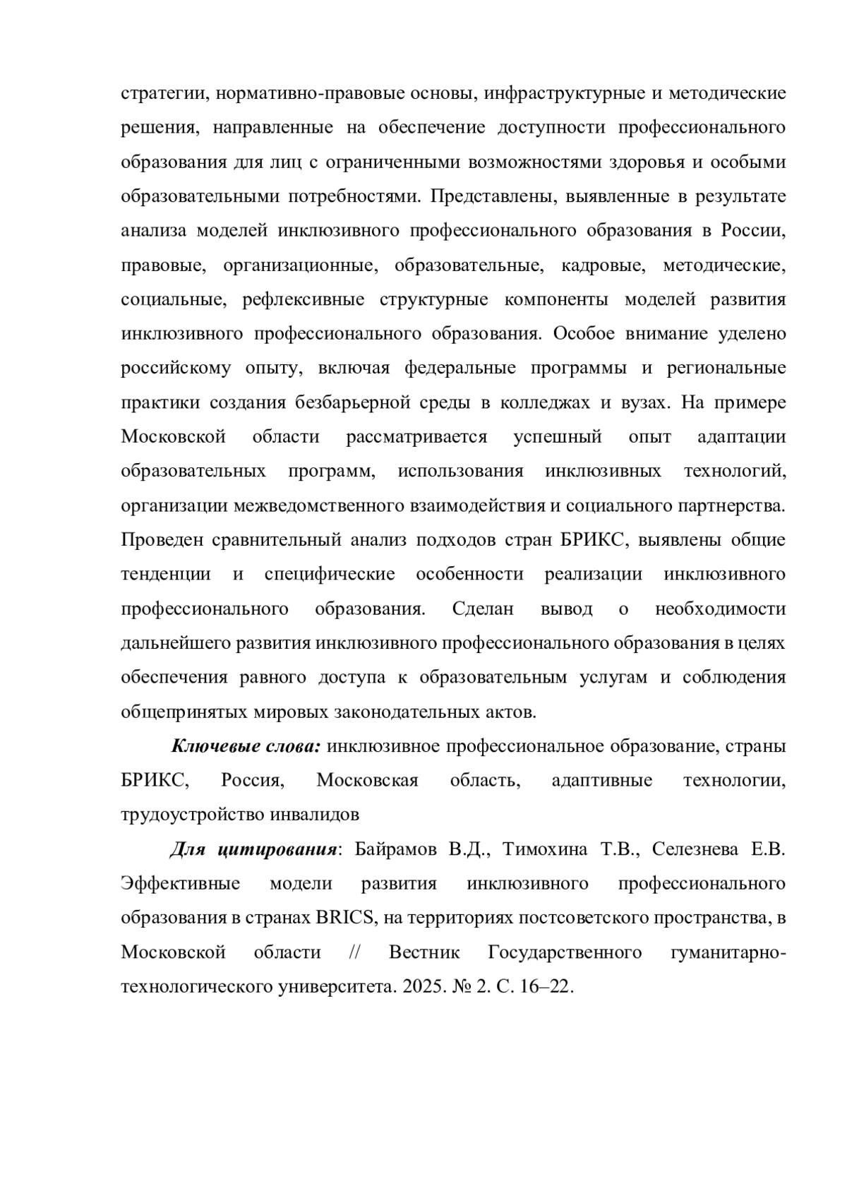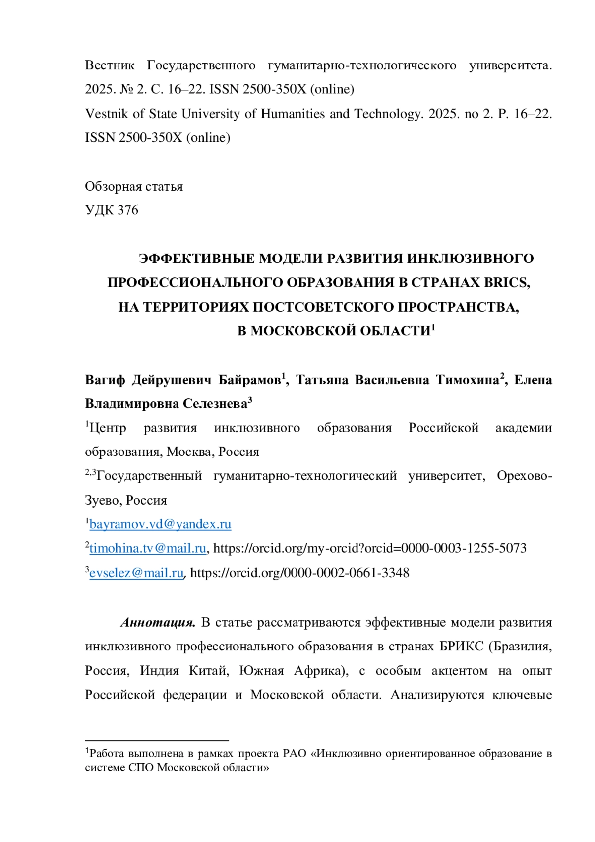 БАЙРАМОВ В. Д., ТИМОХИНА Т. В., СЕЛЕЗНЕВА Е. В. ЭФФЕКТИВНЫЕ МОДЕЛИ РАЗВИТИЯ ИНКЛЮЗИВНОГО ПРОФЕССИОНАЛЬНОГО ОБРАЗОВАНИЯ В СТРАНАХ BRICS, НА ТЕРРИТОРИЯХ ПОСТСОВЕТСКОГО ПРОСТРАНСТВА, В МОСКОВСКОЙ ОБЛАСТИ // ВЕСТНИК ГОСУДАРСТВЕННОГО ГУМАНИТАРНО-ТЕХНОЛОГИЧЕСКОГО УНИВЕРСИТЕТА. 2025. № 2