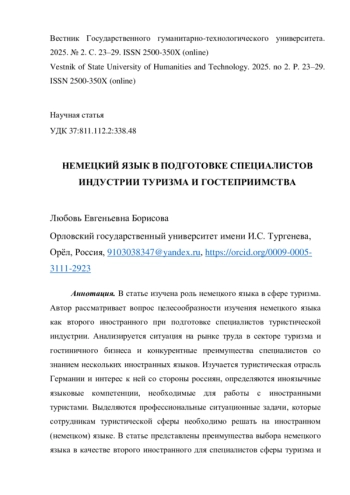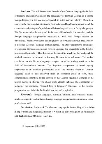 Изучается туристическая отрасль Германии и интерес к ней со стороны россиян, определяются иноязычные языковые компетенции, необходимые для работы с иностранными туристами.