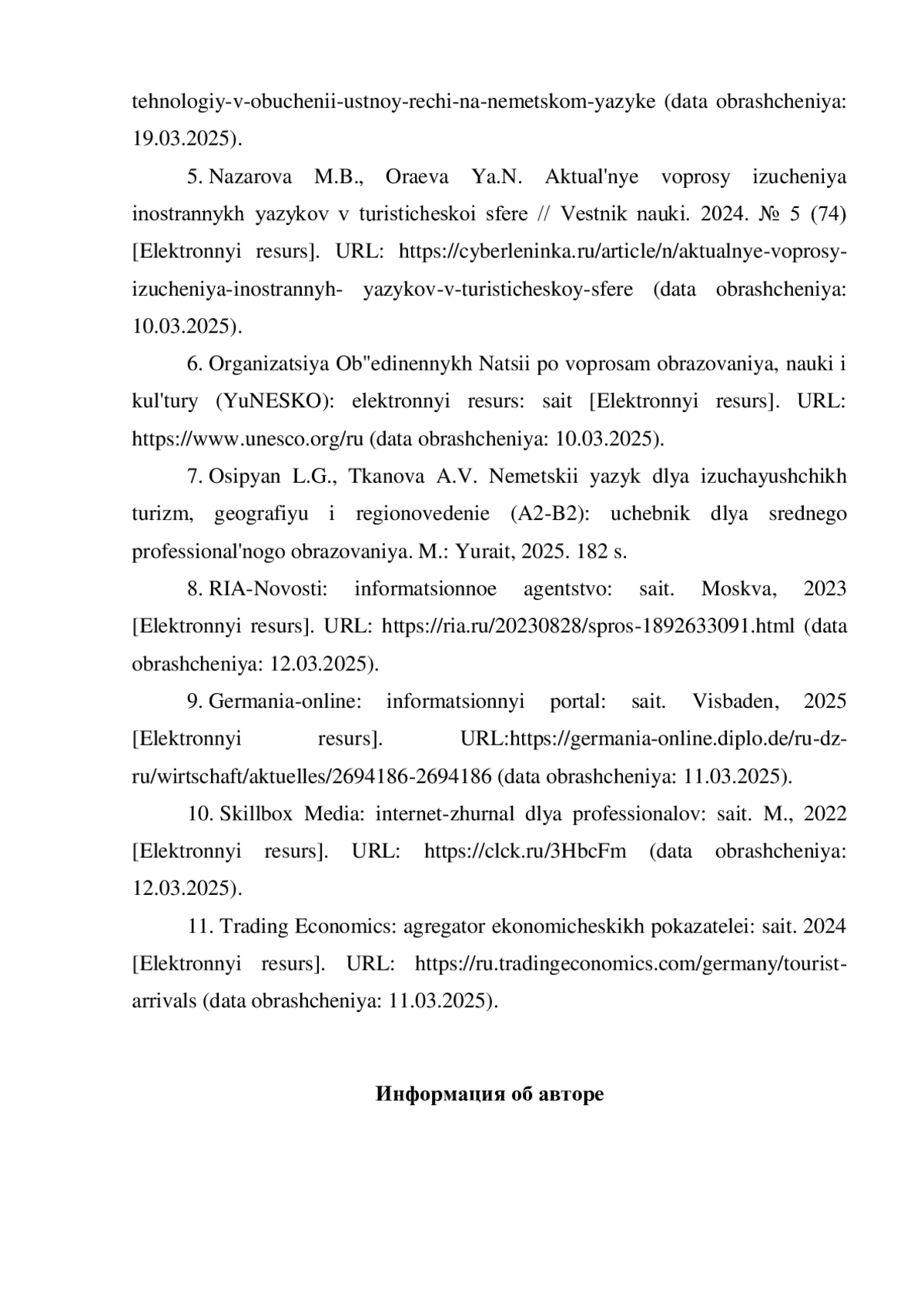 5. Назарова М.Б., Ораева Я.Н. Актуальные вопросы изучения иностранных языков в туристической сфере / Вестник науки. 2024. № 5 (74) [Электронный ресурс]. URL: https://cyberleninka.ru/article/n/aktualnye-voprosy-izucheniya-inostrannyh- yazykov-v-turisticheskoy-sfere (дата обращения: 10.03.2025).