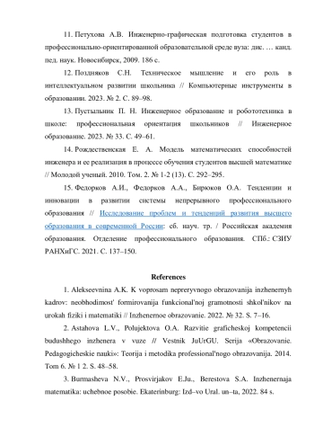 1. Алексеевнина А.К. К вопросам непрерывного образования инженерных кадров: необходимость формирования функциональной грамотности школьников на уроках физики и математики // Инженерное образование. 2022. № 32. С. 7-16.