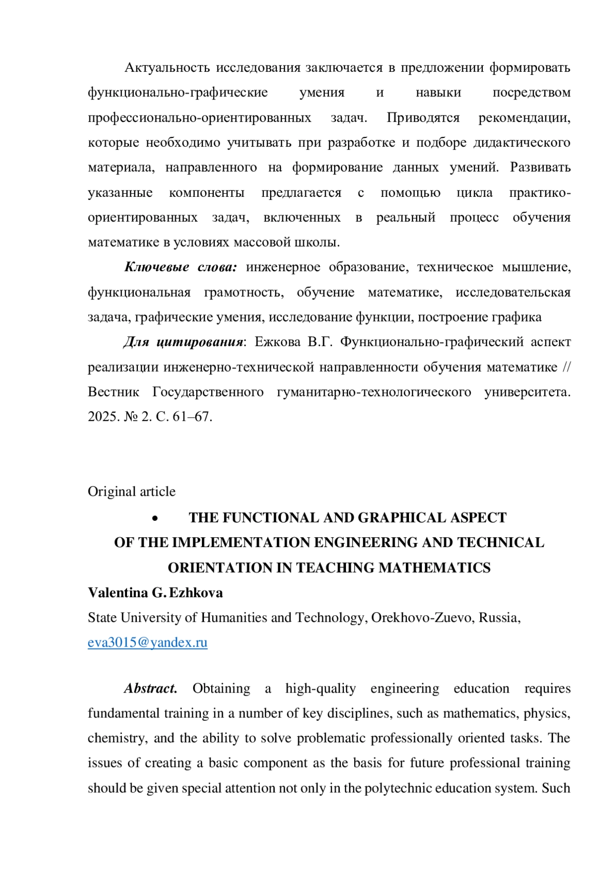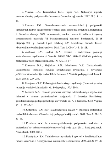 5. Евсеева Е.Г. Совершенствование математической подготовки инженерных кадров как проблема в области теории и методики обучения математике // Донецкие чтения 2021: образование, наука, инновации, культура и вызовы современности: материалы VI Международной научной конференции, 26-28 октября 2021 г. Донецк / под ред. С.В. Беспаловой. Донецк: Изд-во “Донецкий национальный университет”, 2021. Том 6. Часть 3. С. 26-28. EDN: WVRZBF