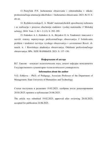 13. Пустыльник П. Н. Инженерное образование и робототехника в школе: профессиональная ориентация школьников // Инженерное образование. 2023. № 33. С. 49-61.