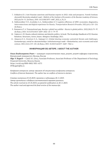 7. Ушкалова Д. И. Антироссийские санкции и экспорт России в 2022 г.: риски и перспективы. Вестник Института экономики Российской академии наук. 2022;6:34-51. https://doi.org/10.52180/2073-6487_2022_6_34_51