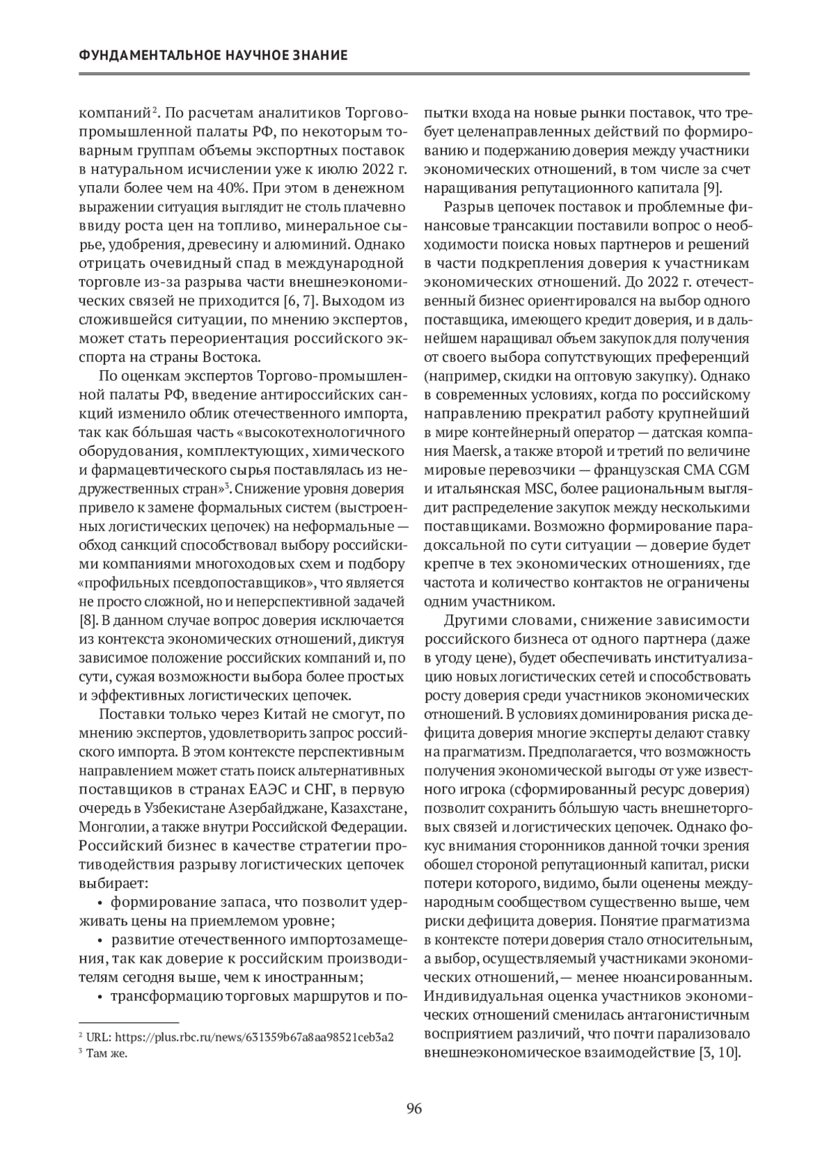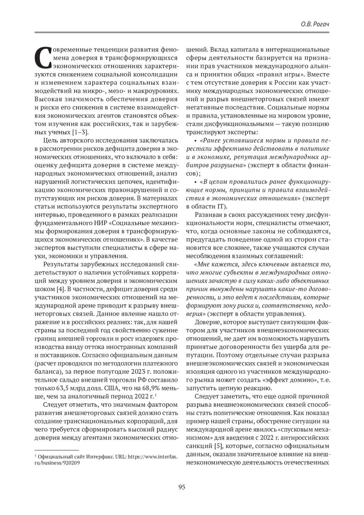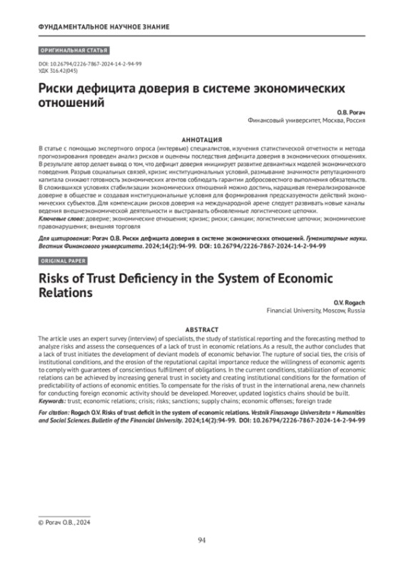 В статье с помощью экспертного опроса (интервью) специалистов, изучения статистической отчетности и метода прогнозирования проведен анализ рисков и оценены последствия дефицита доверия в экономических отношениях. В результате автор делает вывод о том, что дефицит доверия инициирует развитие девиантных моделей экономического поведения. Разрыв социальных связей, кризис институциональных условий, размывание значимости репутационного капитала снижают готовность экономических агентов соблюдать гарантии добросовестного выполнения обязательств. В сложившихся условиях стабилизации экономических отношений можно достичь, наращивая генерализированное доверие в обществе и создавая институциональные условия для формирования предсказуемости действий экономических субъектов. Для компенсации рисков доверия на международной арене следует развивать новые каналы ведения внешнеэкономической деятельности и выстраивать обновленные логистические цепочки.