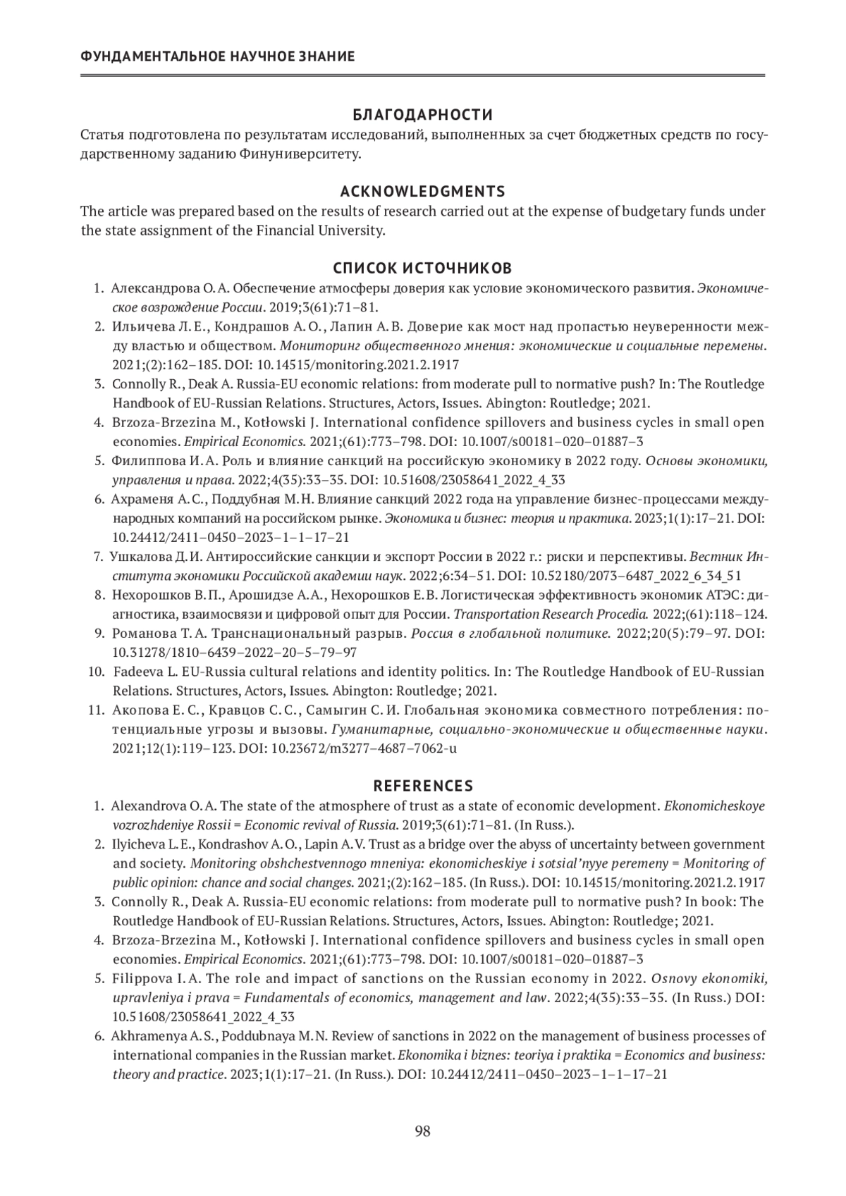 1. Александрова О. А. Обеспечение атмосферы доверия как условие экономического развития. Экономическое возрождение России. 2019;3(61):71-81.