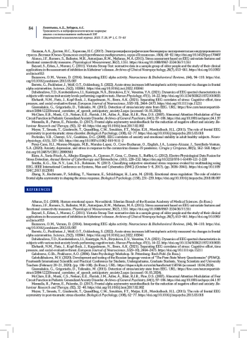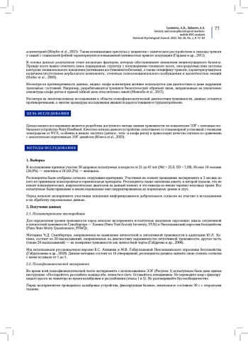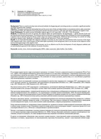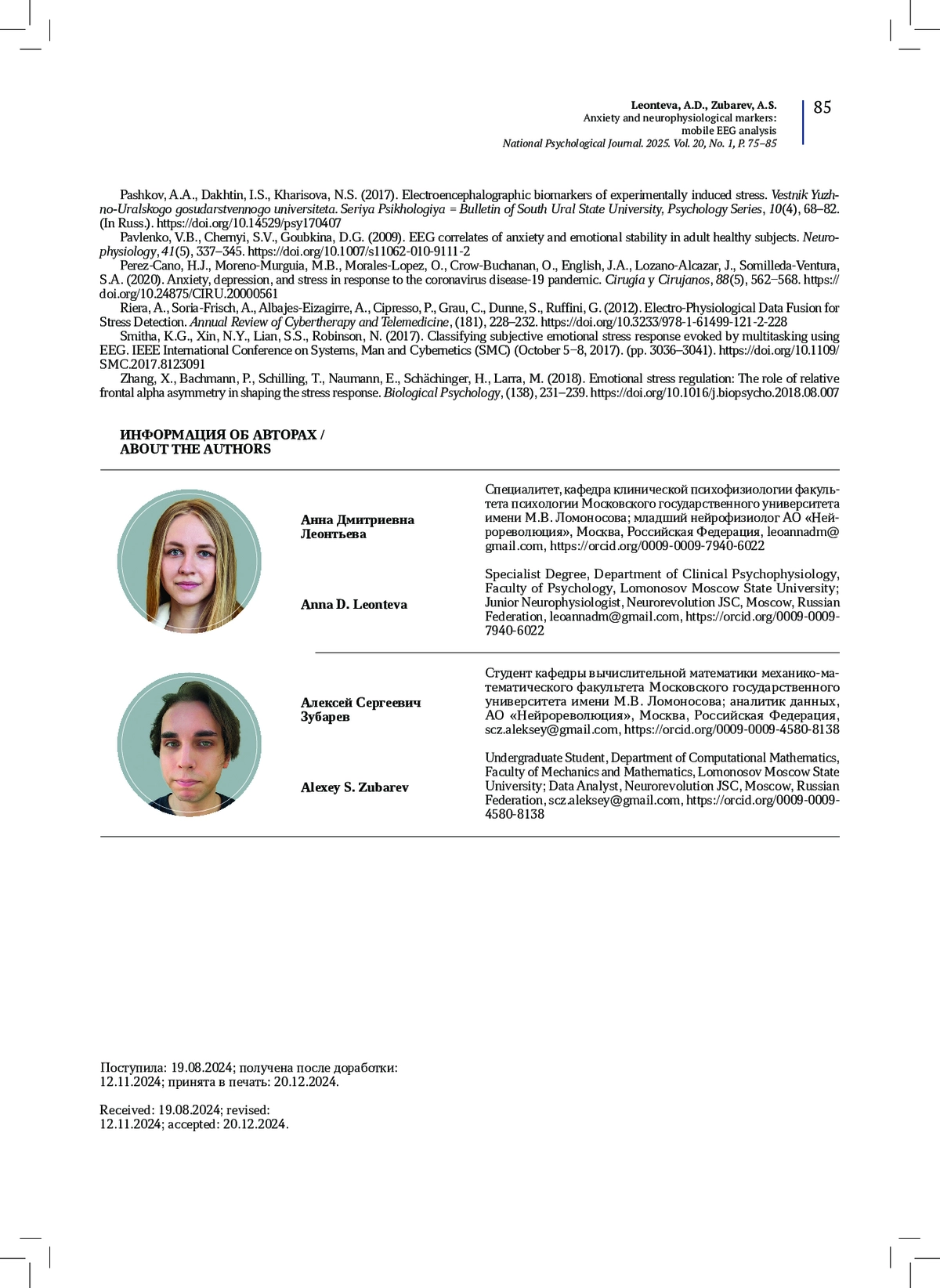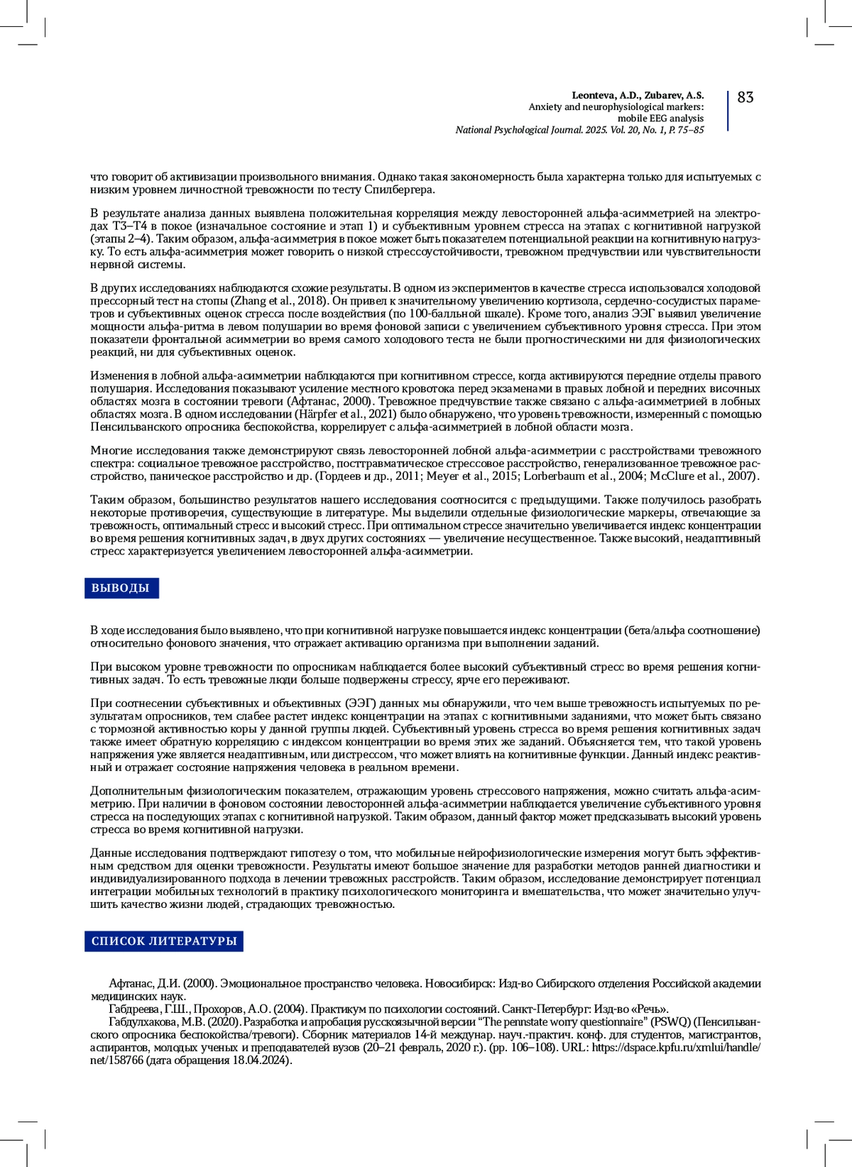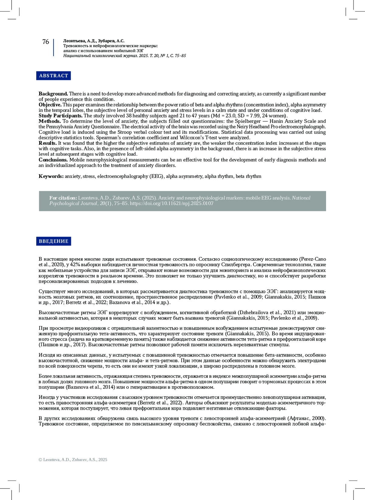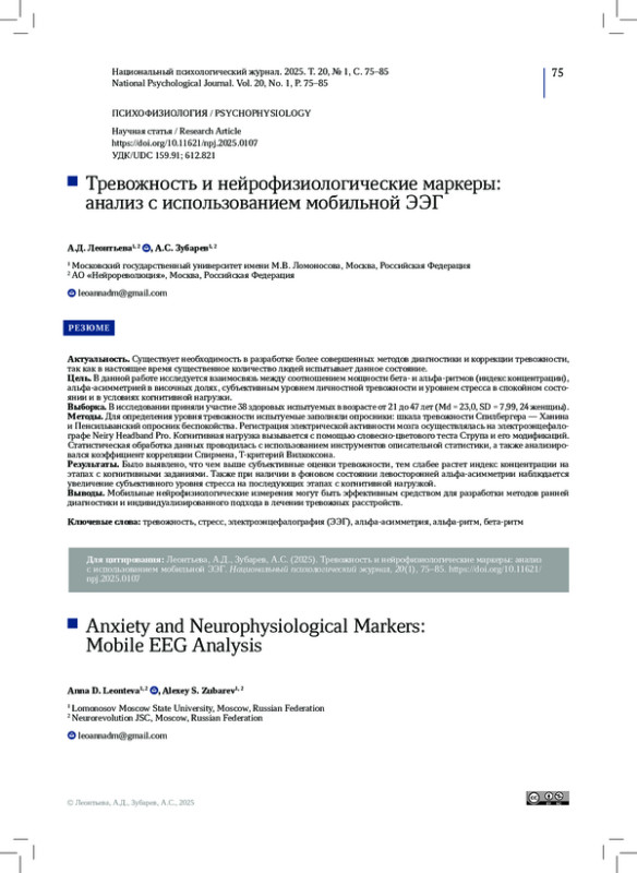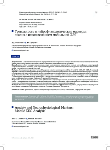 ЛЕОНТЬЕВА А. Д., ЗУБАРЕВ А. С. ТРЕВОЖНОСТЬ И НЕЙРОФИЗИОЛОГИЧЕСКИЕ МАРКЕРЫ: АНАЛИЗ С ИСПОЛЬЗОВАНИЕМ МОБИЛЬНОЙ ЭЭГ // НАЦИОНАЛЬНЫЙ ПСИХОЛОГИЧЕСКИЙ ЖУРНАЛ. 2025. № 1, ТОМ 20