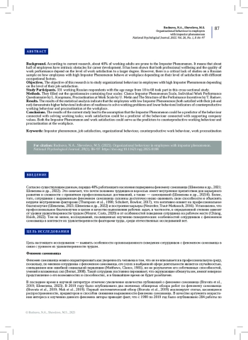 Согласно существующим данным, порядка 40% работающего населения подвержены феномену самозванца (Шевелева и др., 2021; Шевелева и др., 2022). Это означает, что почти половина трудящихся взрослых имеет внутренние препятствия для карьерного развития и сложности с принятием профессиональных достижений, а также — самооценкой (Шевелева и др., 2021б). Более, того, сотрудники с выраженным феноменом самозванца склонны достаточно низко оценивать свои способности и объяснять неудачи внутренними факторами (Thompson et al., 1998; Schubert, Bowker, 2017), что негативно влияет на профессиональное благополучие (Шевелева, 2023; Шевелева и др., 2022) и построение карьеры (Neureiter, Traut-Mattausch, 2016). Установлено, что профессиональное благополучие в целом и качество выполнения рабочих задач, в частности, в определенной степени зависят от уровня удовлетворенности трудом (Meurer, Costa, 2020) и от особенностей поведения сотрудника на рабочем месте (Chiang, Hsieh, 2022). Тем не менее, исследований, посвященных изучению поведенческих особенностей сотрудников с феноменом самозванца в контексте их удовлетворенности факторами труда, среди отечественных исследований нет.