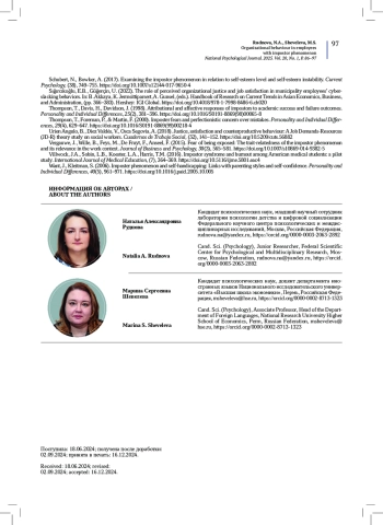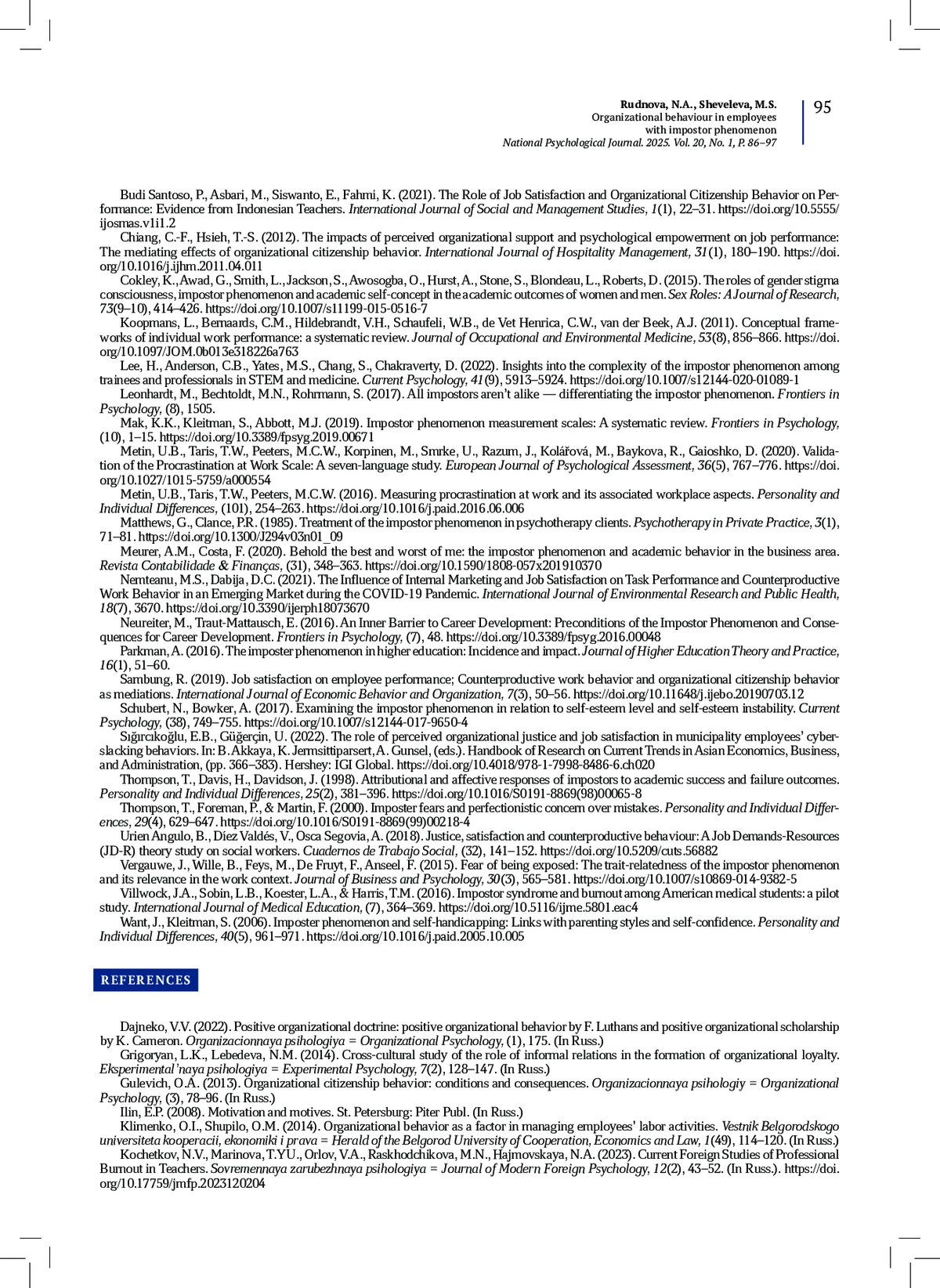 13. Шевелева, М.С., Золотарева, А.А., Руднова, Н.А. (2021а). Феномен самозванца в профессиональной среде: роль мотивации и перфекционизма. Национальный психологический журнал, 3(43), 96-104. DOI: 10.11621/npj.2021.0308
