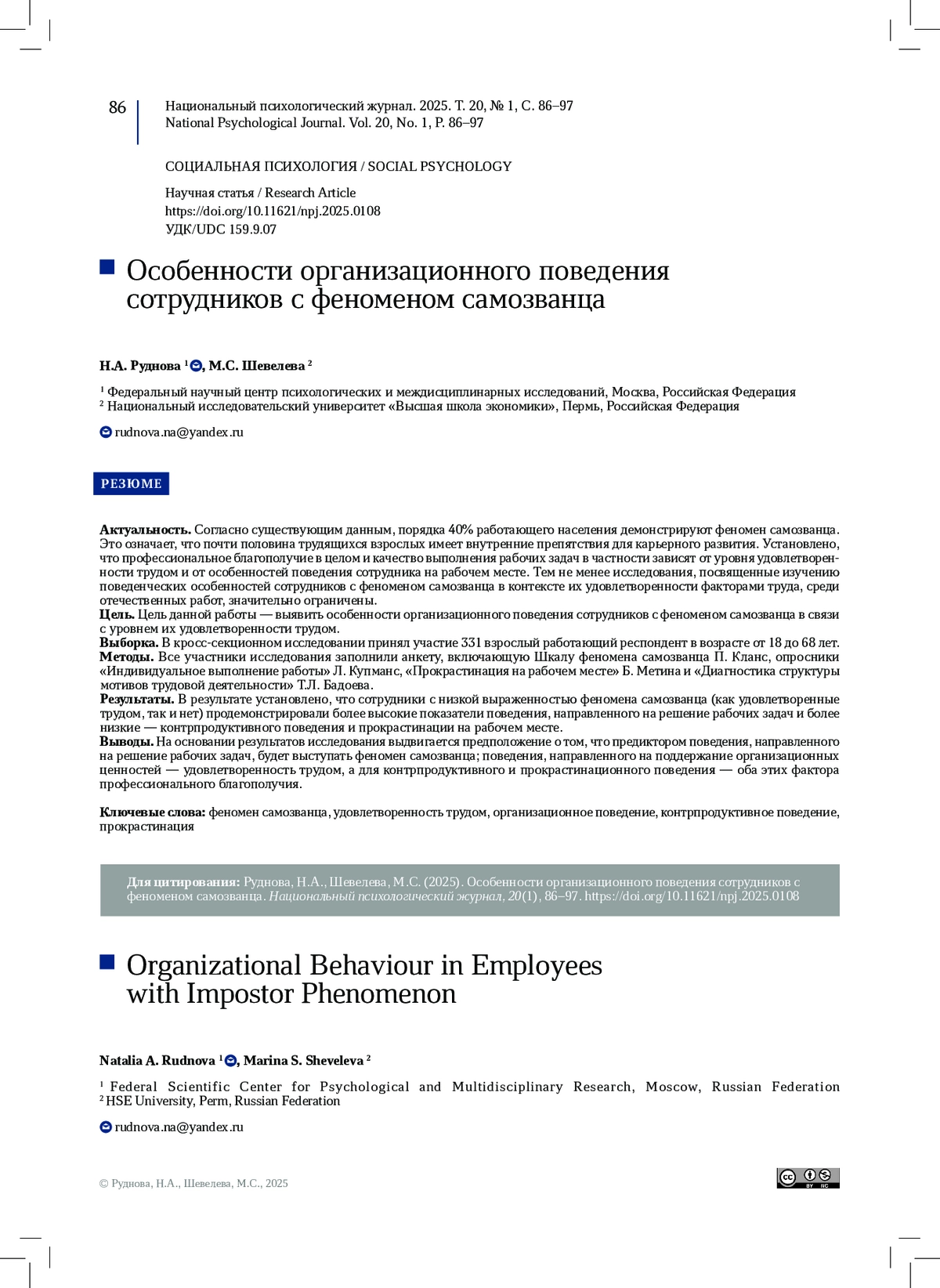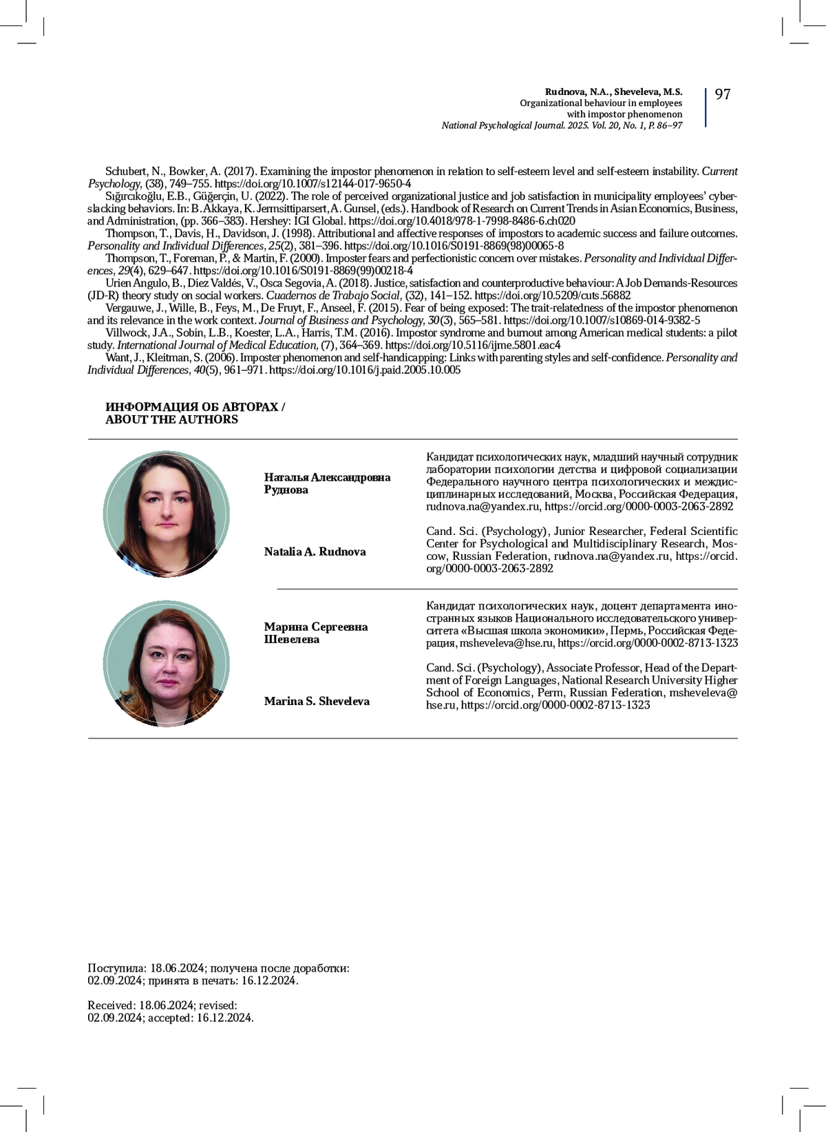15. Шевелева, М.С., Корниенко, Д.С., Пермякова, Т.М. (2021б). Шкала феномена самозванца: психометрические характеристики русскоязычной версии. Психологический журнал, 42(1), 132-142. DOI: 10.31857/S020595920013343-3 EDN: CPKCZX