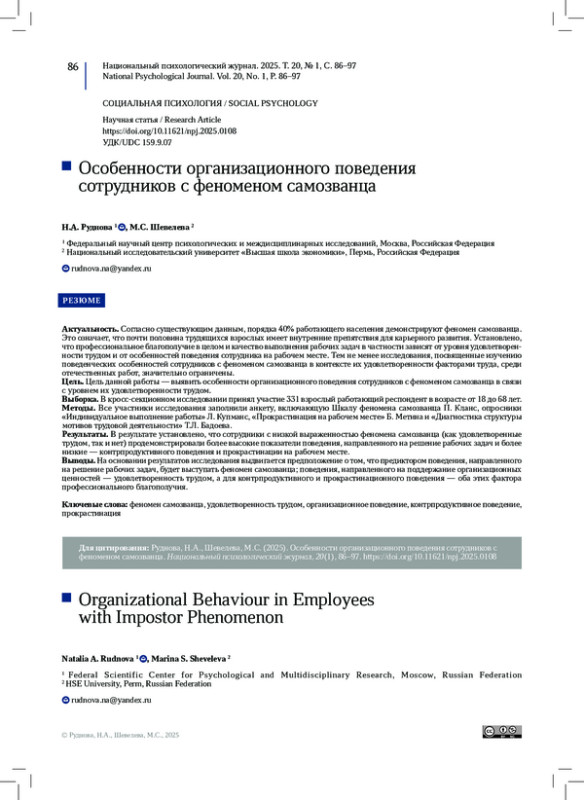 Цель. Цель данной работы — выявить особенности организационного поведения сотрудников с феноменом самозванца в связи с уровнем их удовлетворенности трудом. Выборка. В кросс-секционном исследовании принял участие 331 взрослый работающий респондент в возрасте от 18 до 68 лет.