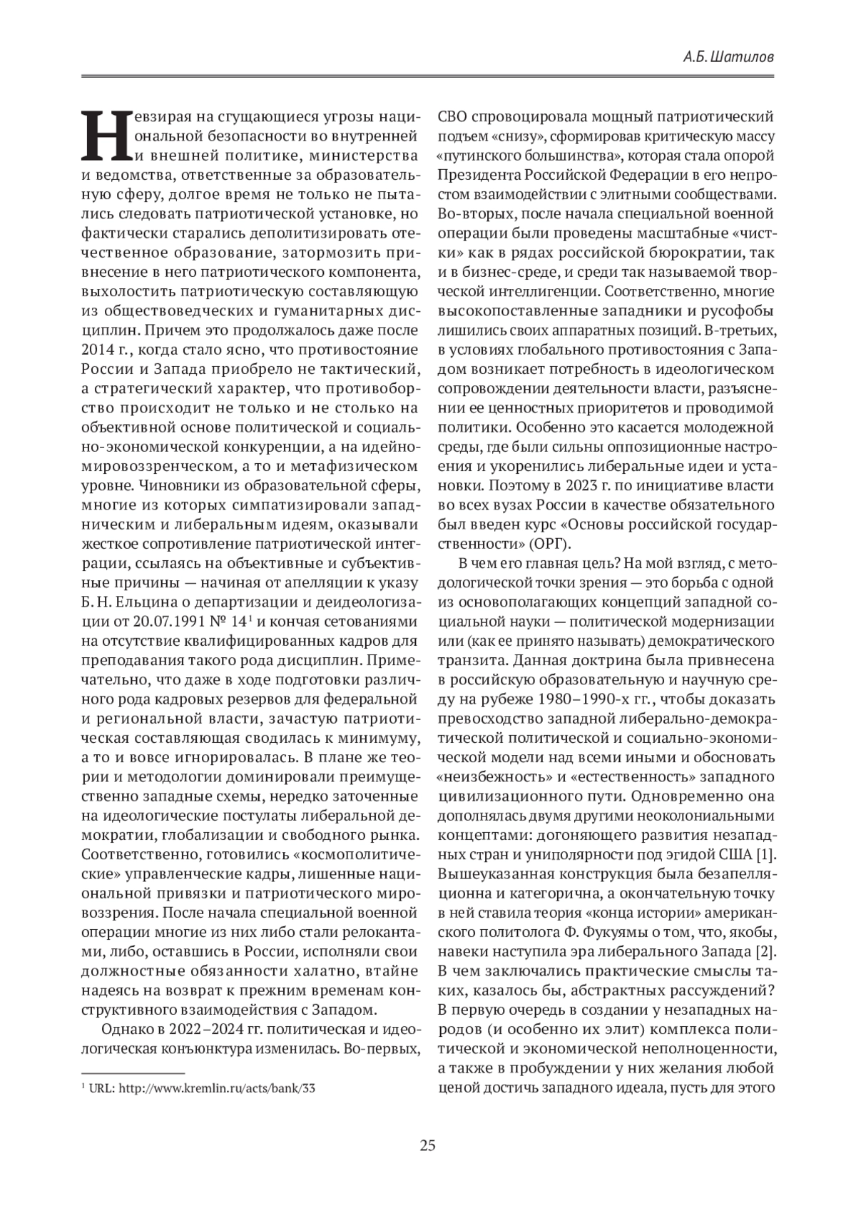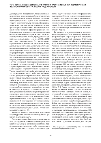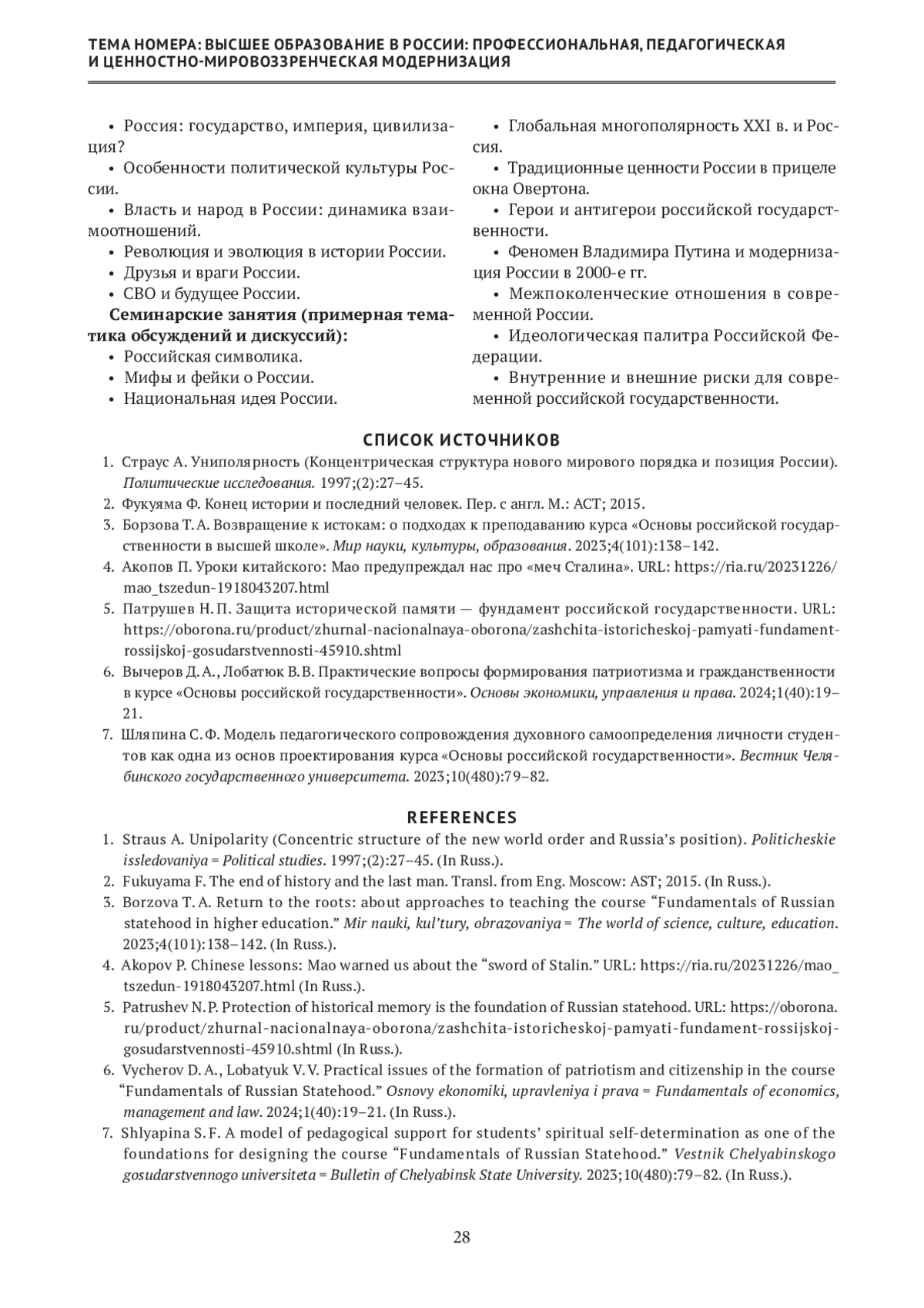 7. Шляпина С. Ф. Модель педагогического сопровождения духовного самоопределения личности студентов как одна из основ проектирования курса «Основы российской государственности». Вестник Челябинского государственного университета. 2023;10(480):79-82.