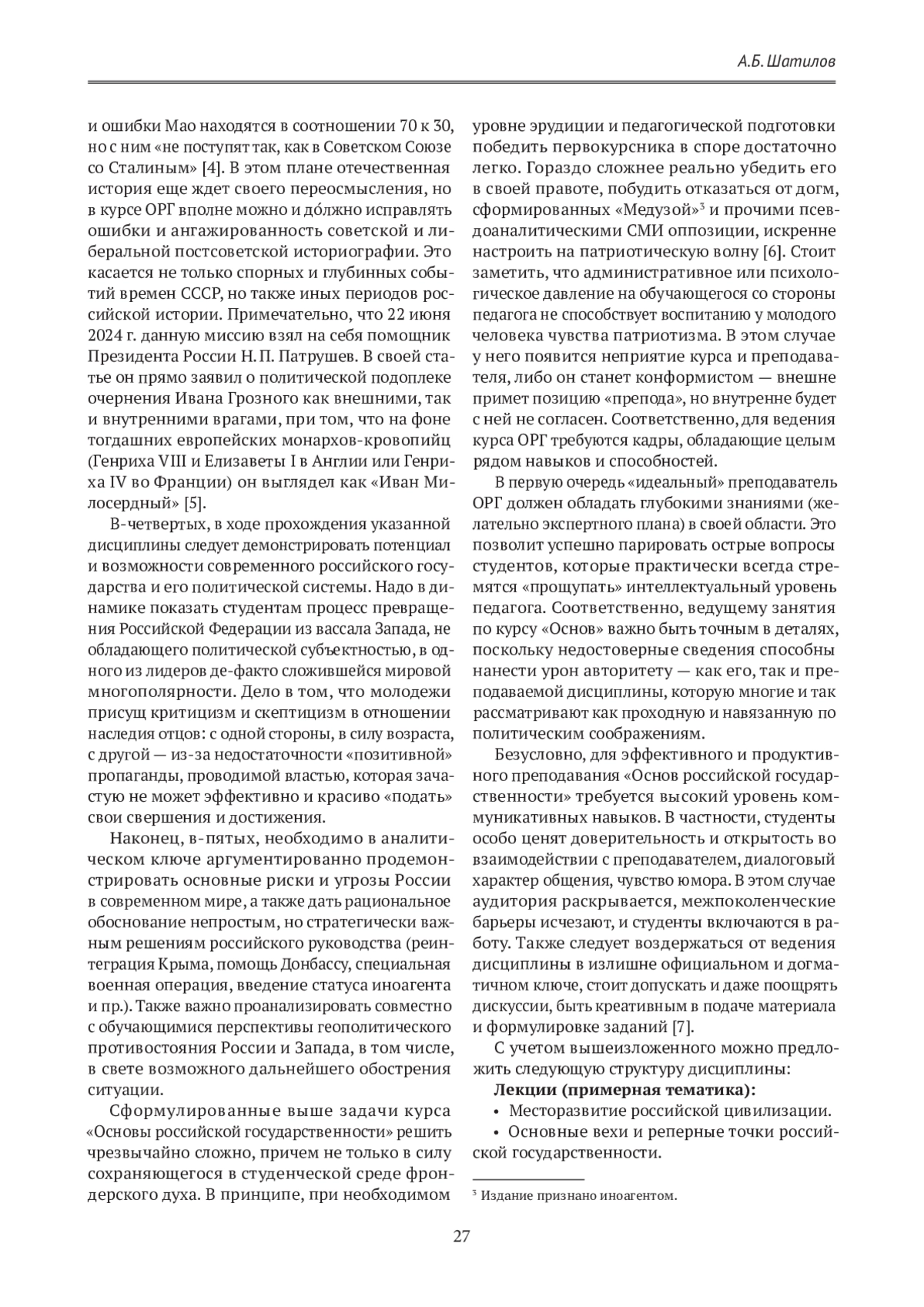 Несмотря на то, что патриотизм уже достаточно давно был объявлен российским руководством национальной идеей нашей страны, вплоть до начала специальной военной операции в 2022 г. в системе как среднего, так и высшего образования не наблюдалось ее практической реализации. В статье анализируются проблемы преподавания курса «Основы российской государственности», введенного в программы всех российских вузов в сентябре 2023 г. Опираясь на собственный опыт ведения данной дисциплины, автор дает свое видение целей и задач данного курса с учетом политической конъюнктуры и стратегических национальных интересов России. Кроме того, предлагается и обосновывается авторская версия тематики лекционных и семинарских занятий.