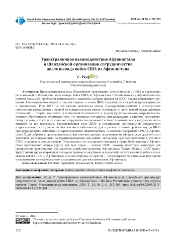 Проанализирована роль Шанхайской организации сотрудничества (ШОС) в укреплении региональной стабильности после вывода войск США из Афганистана. Нестабильность в Афганистане становится серьезной проблемой регионального масштаба, которая требует от ШОС поиска приемлемого решения. Рассматривается вопрос о том, как страны - члены ШОС справляются с углубляющимся кризисом в Афганистане. Роль ШОС в достижении консенсуса между государствами-членами в долгосрочной перспективе раскрывается с опорой на концептуальные рамки, состоящие из двух теорий международных отношений - теории комплекса региональной безопасности и теории функционального сотрудничества, которые обеспечивают понимание того, что интересы государств, принадлежащих к единому географическому региону, схожи, и их взаимное сотрудничество оказывается более прочным, чем у государств, находящихся за его пределами. Рассматривается роль ШОС в поддержании региональной безопасности и прослеживаются ее усилия по обеспечению стабильности. Для изучения сложных проблем внутри ШОС при формировании отношений с зарождающимся правительством «Талибана» (запрещен в РФ) в Афганистане были собраны и проанализированы фактические данные, полученные из официальных документов и заявлений, опубликованных на правительственных веб-сайтах, материалы научных публикаций, статей в СМИ, изданных в разных странах. Установлено, что ухудшение ситуации в сфере безопасности в Афганистане представляет общую угрозу для всех стран - членов ШОС, поэтому необходим консенсус для продвижения практических мер, включая содействие развитию Афганистана. Таким образом, ШОС сосредотачивается на устранении непосредственных и ощутимых последствий захвата власти талибами после вывода войск США из Афганистана, с одной стороны, а с другой - на поддержке региональных государств в налаживании функционального сотрудничества для восстановления Афганистана.