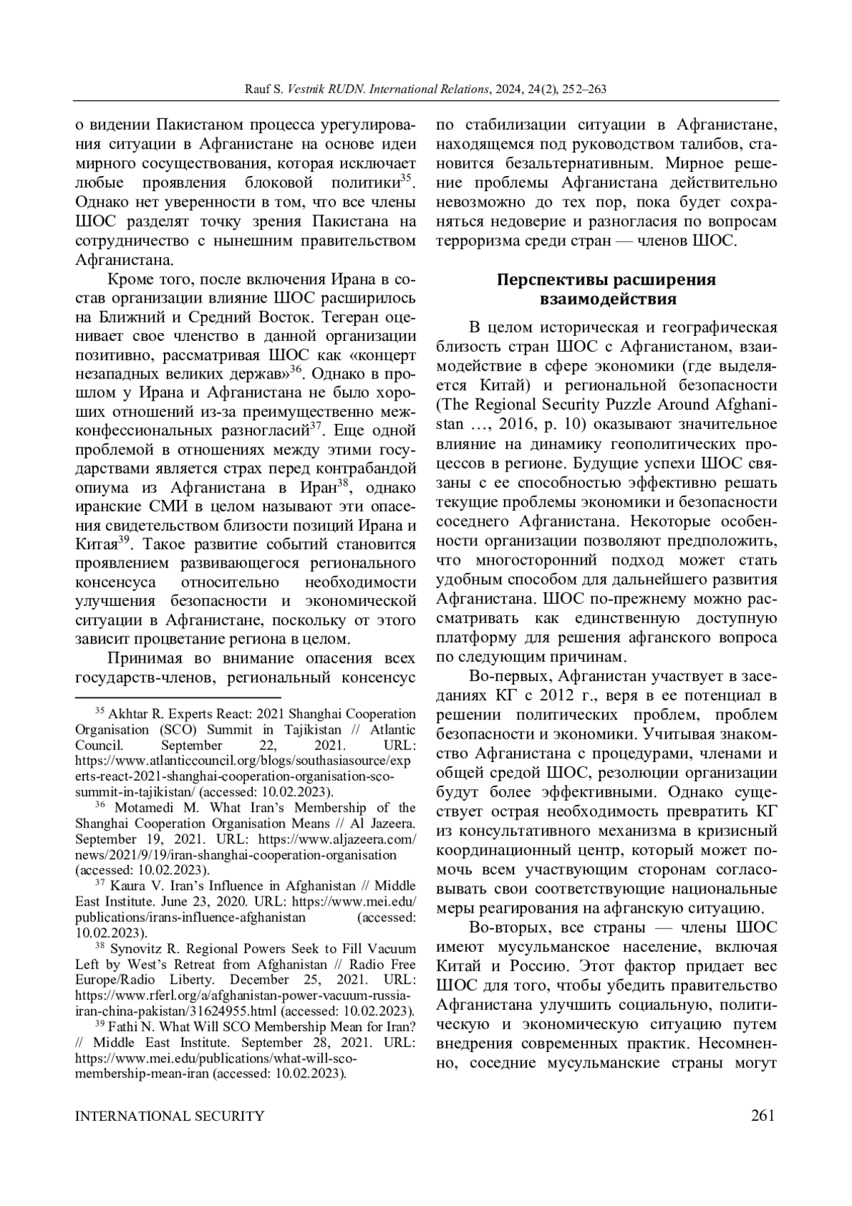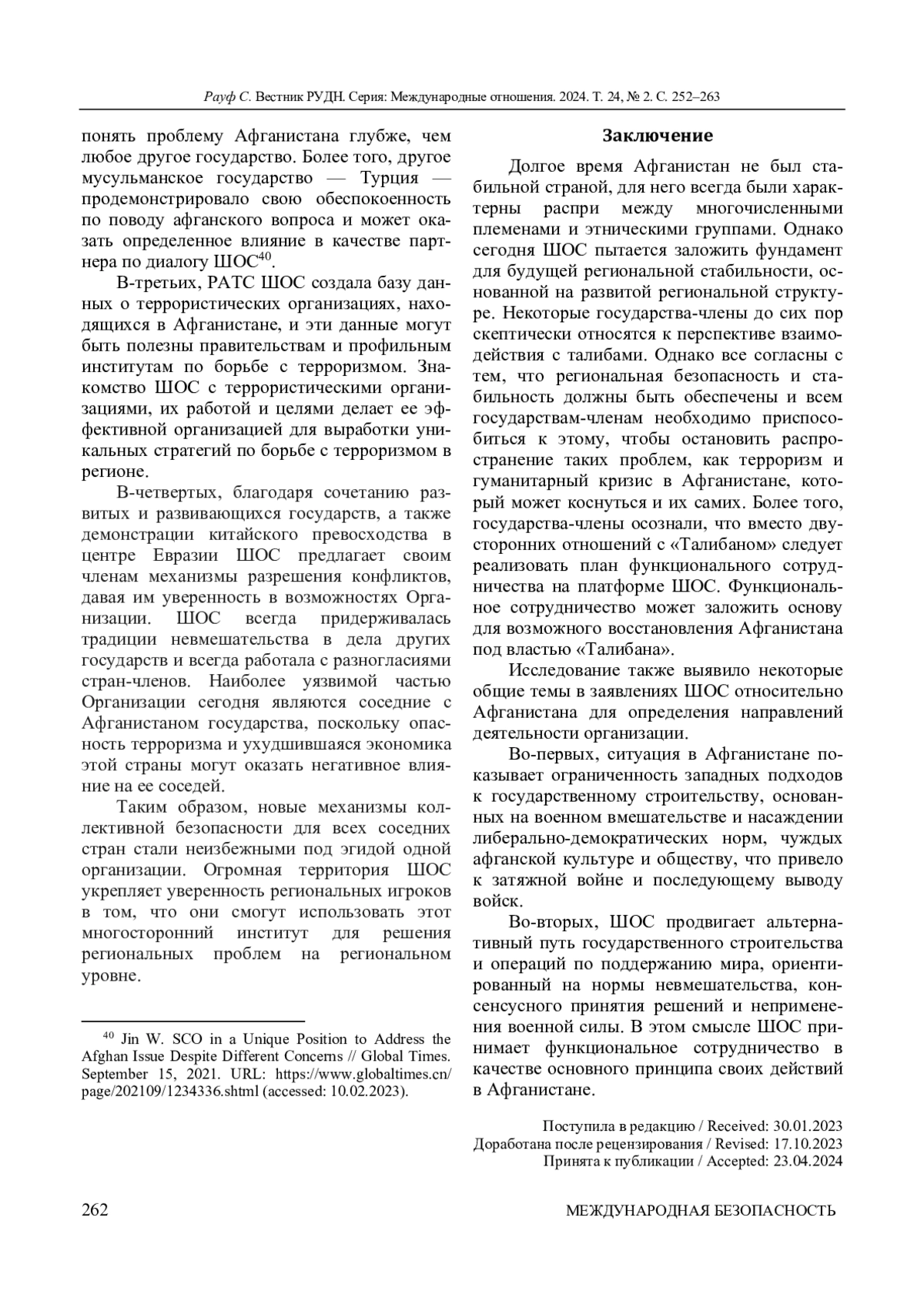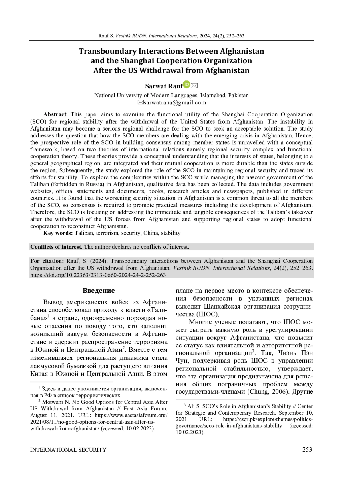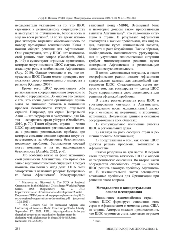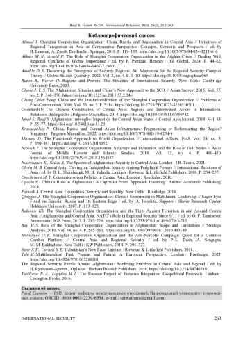 2. Akhtar M. N., Javaid F. The Role of Shanghai Cooperation Organization in the Afghan Crisis // Dealing With Regional Conflicts of Global Importance / ed. by P. Pietrzak. Hershey: IGI Global, 2024. P. 44-62. DOI: 10.4018/978-1-6684-9467-7.ch003