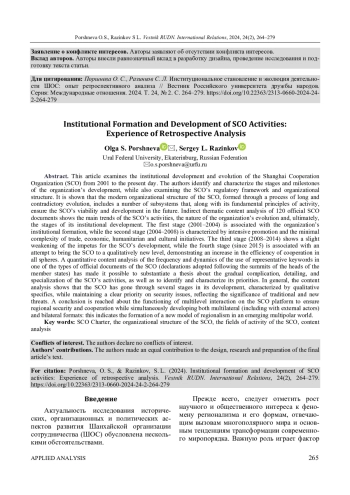Рассматривается институциональное развитие и эволюция Шанхайской организации сотрудничества (ШОС) с 2001 г. по настоящее время. Авторы выделяют и характеризуют этапы и вехи развития организации, а также изучают нормативную базу и организационную структуру ШОС. Показано, что современная организационная структура ШОС, сформировавшаяся в процессе длительной и противоречивой эволюции, включает ряд подсистем, которые наряду с основополагающими принципами деятельности обеспечивают жизнеспособность и развитие ШОС в будущем. Ненаправленный тематический контент-анализ 120 официальных документов ШОС позволил выявить основные направления деятельности ШОС, характер эволюции организации и в конечном итоге этапы ее институционального развития. Первый этап (2001-2004 гг.) связан с институциональным становлением организации, второй (2004-2008 гг.) - характеризуется интенсивным продвижением и минимальной сложностью торгово-экономических, гуманитарных и культурных инициатив. Третий этап (2008-2014 гг.) демонстрирует некоторое ослабление импульса развития ШОС, тогда как четвертый этап (с 2015 г.) обусловлен стремлением вывести ШОС на качественно новый уровень с ростом эффективности сотрудничества во всех сферах. Количественный контент-анализ частоты и динамики употребления репрезентативных ключевых слов одного из видов официальных документов ШОС - деклараций, принятых по итогам саммитов глав государств - членов организации, позволил обосновать тезис о постепенном усложнении, детализации и специализации направлений деятельности ШОС, выявить и охарактеризовать динамику ее приоритетов. В целом контент-анализ показывает, что ШОС в своем развитии прошла несколько этапов, отличающихся качественной спецификой, сохраняя при этом четкий приоритет вопросов безопасности, отражающий значимость традиционных и новых угроз. Сделан вывод о функционировании на платформе ШОС многоуровневого взаимодействия по обеспечению региональной безопасности и сотрудничества при одновременном развитии как многосторонних, в том числе с внешними акторами, так и двусторонних его форматов, что свидетельствует о формировании новой модели регионализма в условиях становления многополярного мира.
