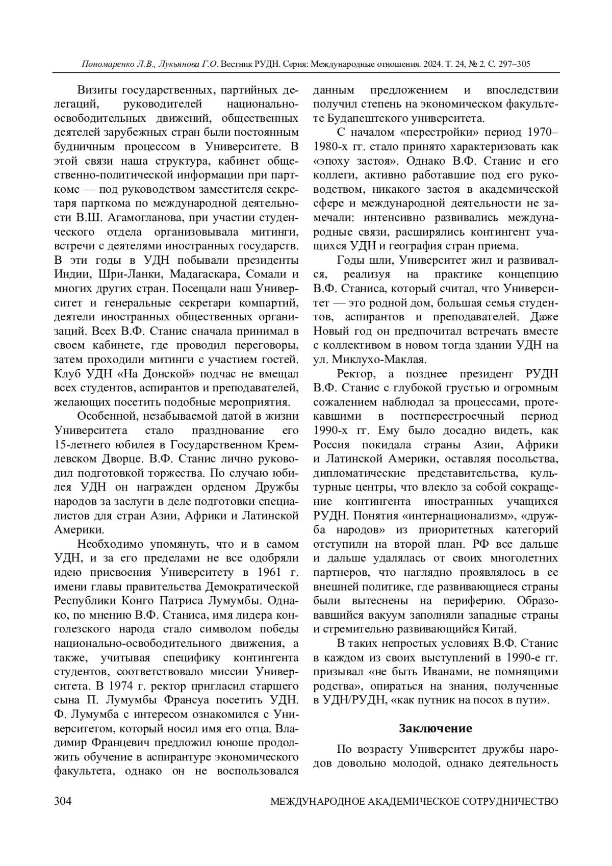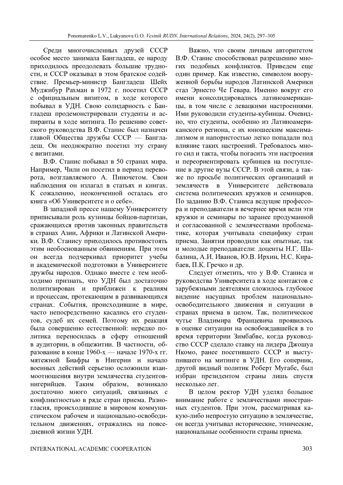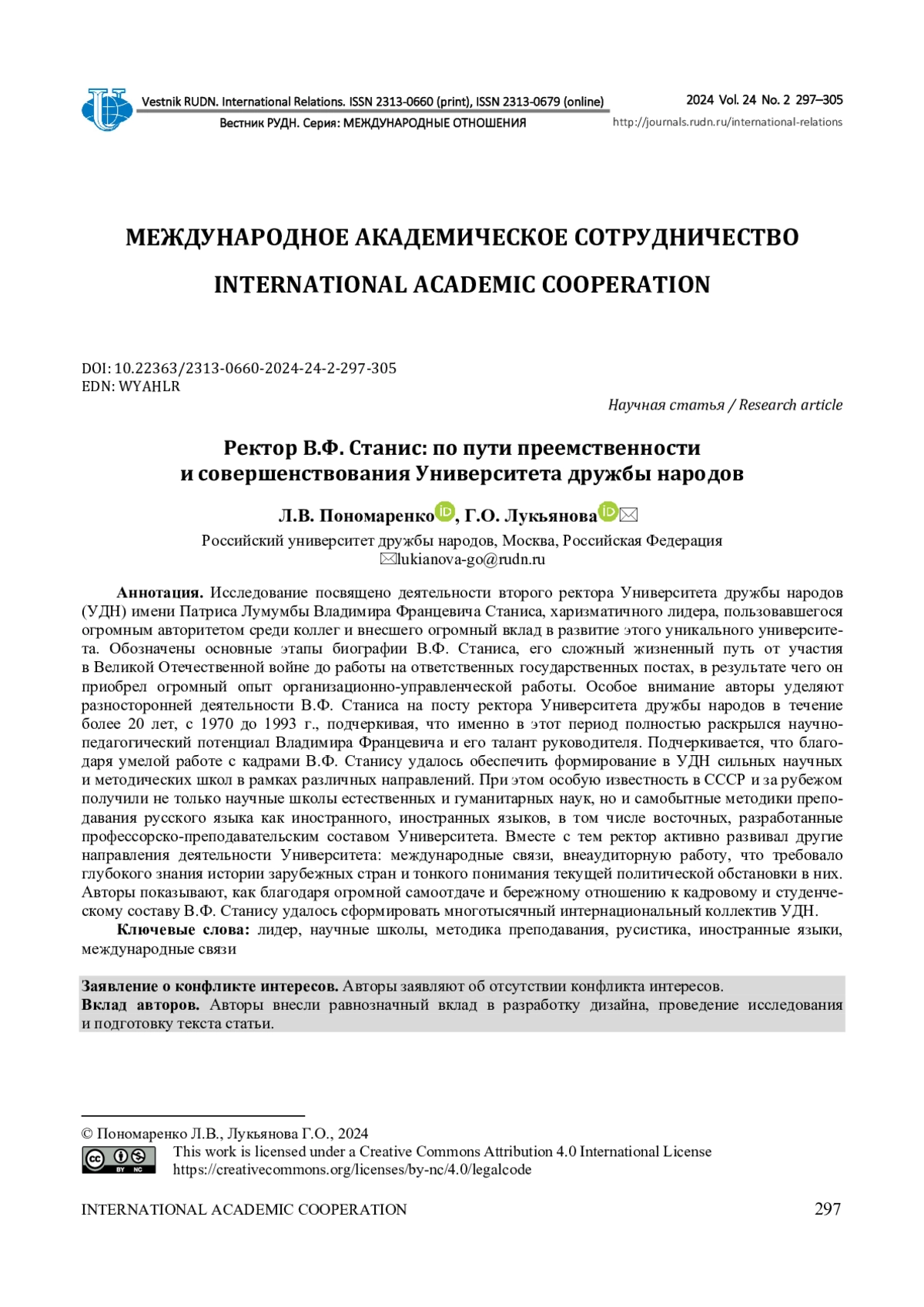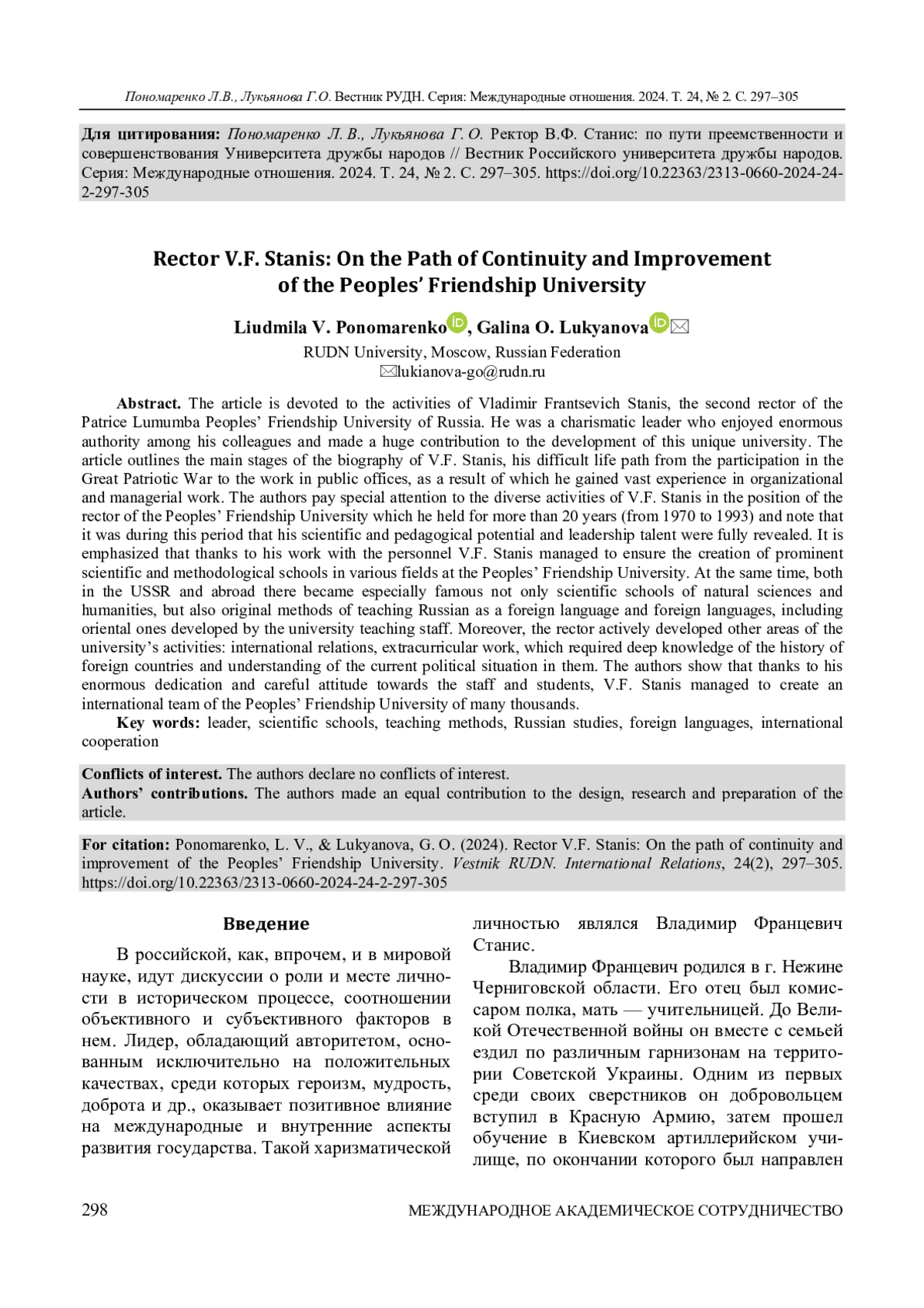 Исследование посвящено деятельности второго ректора Университета дружбы народов (УДН) имени Патриса Лумумбы Владимира Францевича Станиса, харизматичного лидера, пользовавшегося огромным авторитетом среди коллег и внесшего огромный вклад в развитие этого уникального университета. Обозначены основные этапы биографии В. Ф. Станиса, его сложный жизненный путь от участия в Великой Отечественной войне до работы на ответственных государственных постах, в результате чего он приобрел огромный опыт организационно-управленческой работы. Особое внимание авторы уделяют разносторонней деятельности В. Ф. Станиса на посту ректора Университета дружбы народов в течение более 20 лет, с 1970 до 1993 г., подчеркивая, что именно в этот период полностью раскрылся научно-педагогический потенциал Владимира Францевича и его талант руководителя. Подчеркивается, что благодаря умелой работе с кадрами В. Ф. Станису удалось обеспечить формирование в УДН сильных научных и методических школ в рамках различных направлений. При этом особую известность в СССР и за рубежом получили не только научные школы естественных и гуманитарных наук, но и самобытные методики преподавания русского языка как иностранного, иностранных языков, в том числе восточных, разработанные профессорско-преподавательским составом Университета. Вместе с тем ректор активно развивал другие направления деятельности Университета: международные связи, внеаудиторную работу, что требовало глубокого знания истории зарубежных стран и тонкого понимания текущей политической обстановки в них. Авторы показывают, как благодаря огромной самоотдаче и бережному отношению к кадровому и студенческому составу В. Ф. Станису удалось сформировать многотысячный интернациональный коллектив УДН.
