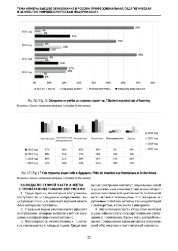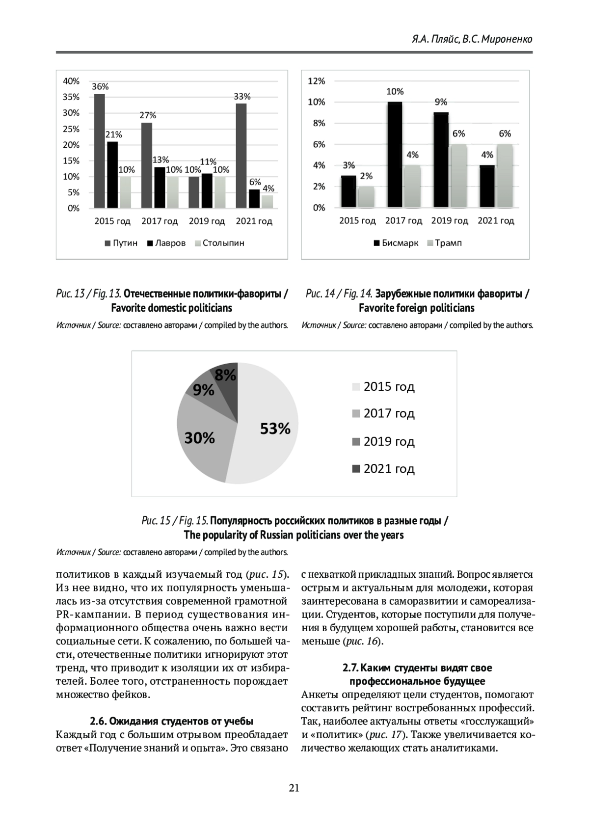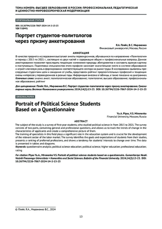 В качестве предмета исследования выступают анкеты первокурсников, обучавшихся по направлению «Политология» в период с 2015 по 2021 г., состоящие из двух частей и содержащие общие и профессиональные вопросы. Данное анкетирование позволяет проследить тенденции изменения природы абитуриентов и составить единую картину о поступающих. Подготовка специалистов этого профиля занимает значительное место в системе образования и играет ключевую роль в формировании соответствующего сектора на рынке труда. В исследовании выявлены преследуемые студентами цели и ожидания от учебы, представлен рейтинг предпочтительных профессий и тенденция смены интересов у первокурсников в разные годы. Информация внесена в таблицы, а также показана на диаграммах.