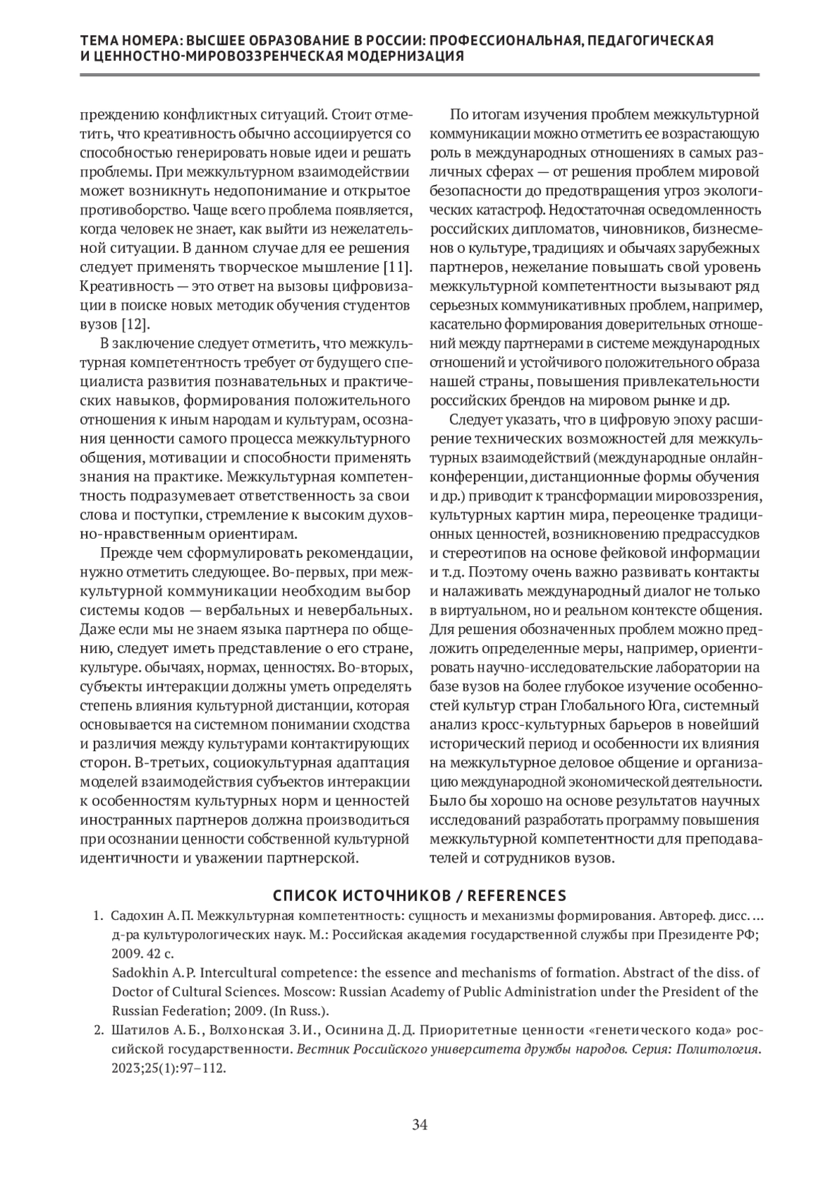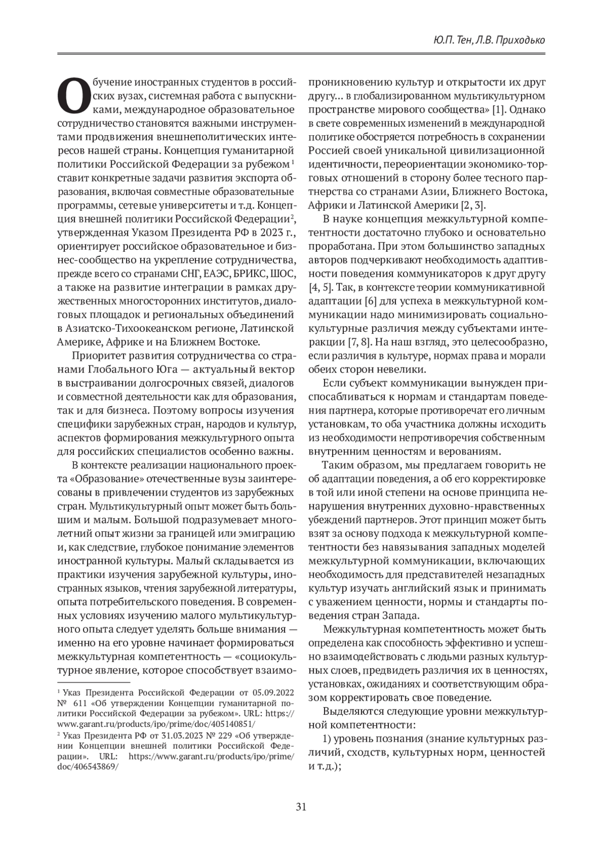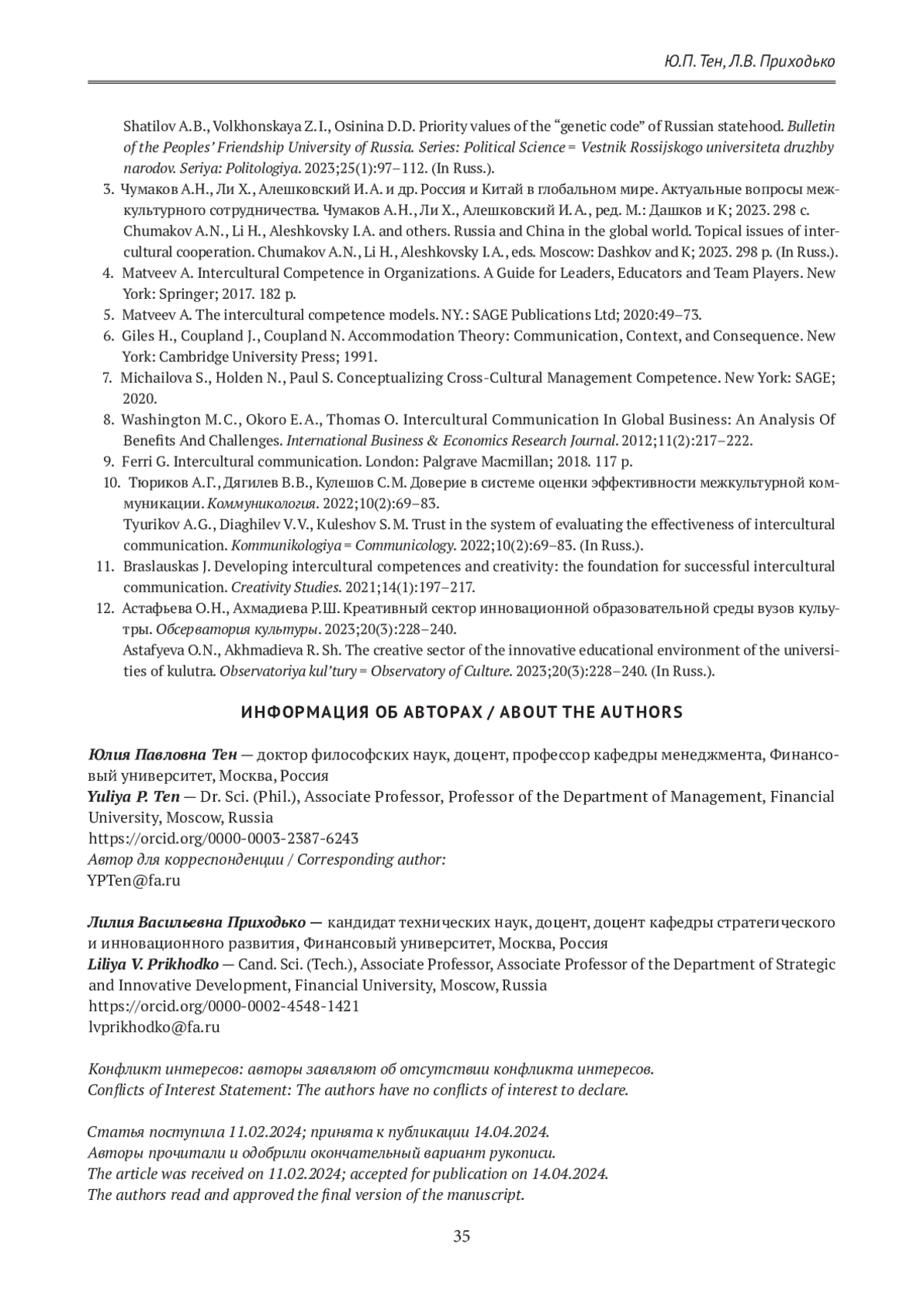 ТЕН Ю. П., ПРИХОДЬКО Л. В. РЕКОМЕНДАЦИИ ПО ФОРМИРОВАНИЮ МЕЖКУЛЬТУРНОЙ КОМПЕТЕНТНОСТИ У СТУДЕНТОВ ВУЗОВ // ГУМАНИТАРНЫЕ НАУКИ. ВЕСТНИК ФИНАНСОВОГО УНИВЕРСИТЕТА. 2024. ТОМ 14, № 2