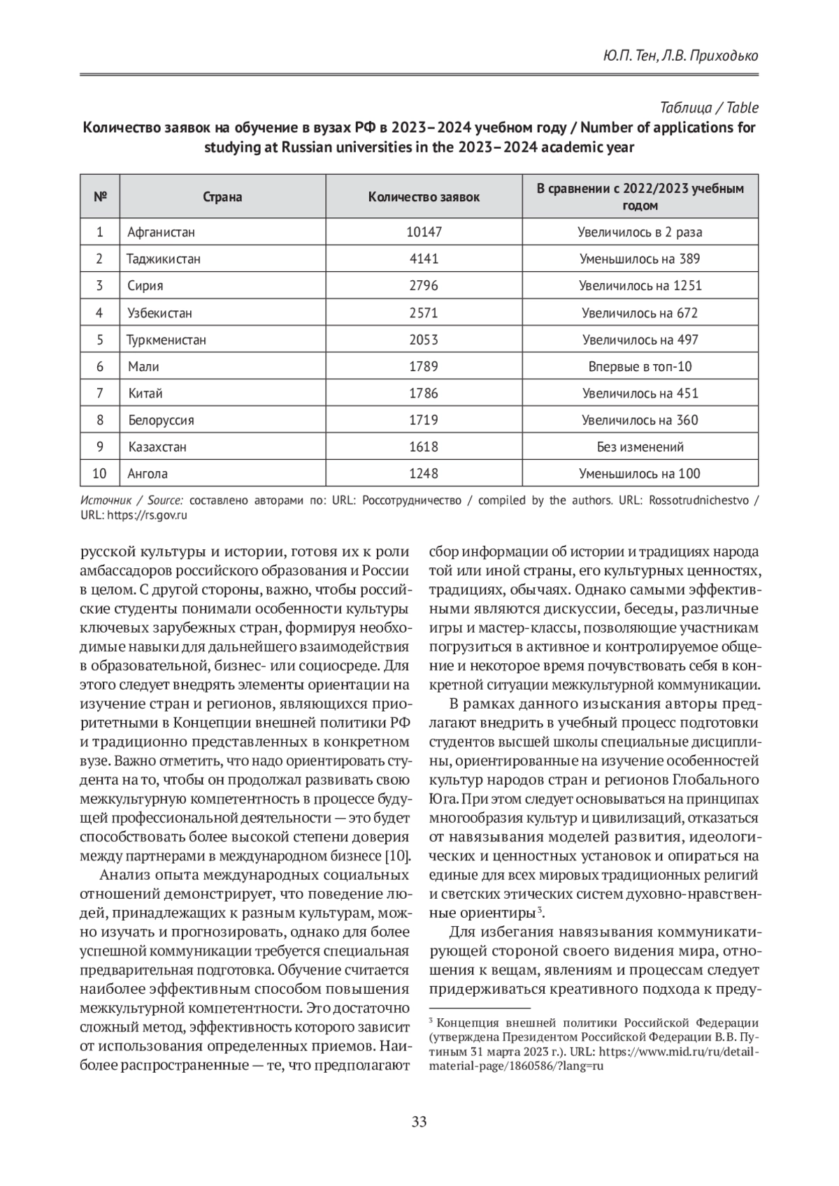 Актуальность статьи обусловлена необходимостью конструирования нового взгляда на сущность и особенности формирования кросс-культурной компетентности. Изменения политико-стратегических и торгово-экономических векторов сотрудничества в России нуждаются в теоретическом и практическом осмыслении с точки зрения потребности в подготовке специалистов к работе за рубежом. Целью исследования является разработка рекомендаций по формированию межкультурной компетентности у обучающихся в российских вузах. Методология работы включает анализ и синтез научной литературы, структурно-системный подход. Кроме того, авторами анализируются статистические данные, а также разработаны меры по направлениям формирования межкультурной компетентности, включающие рекомендации внедрить в учебный процесс подготовки студентов специальные дисциплины, ориентированные на изучение особенностей культур народов, стран и регионов Глобального Юга, и создать специальные программы повышения квалификации сотрудников и преподавателей вузов.