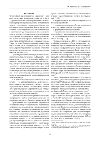 16. Вотякова А. В., Поляков Ю. Н. Подходы к определению эффективности событийного маркетинга. Менеджмент: теория и практика. 2020;(1-3):176-180.