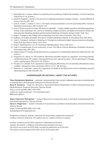 15. Котляревская Н. В. Фестиваль моды и дизайна как составляющая культурного бренда. Манускрипт. 2020;13(3):184-188.