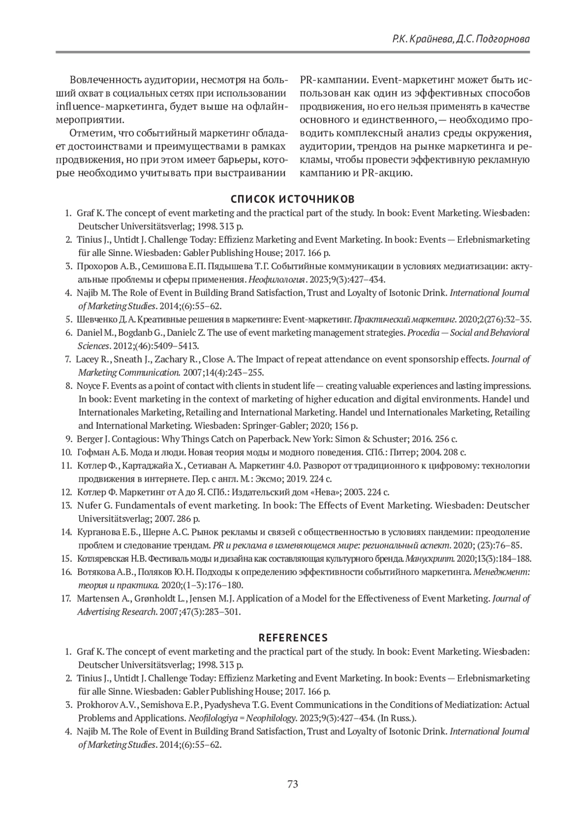 3. Прохоров А. В., Семишова Е. П. Пядышева Т. Г. Событийные коммуникации в условиях медиатизации: актуальные проблемы и сферы применения. Неофилология. 2023;9(3):427-434.