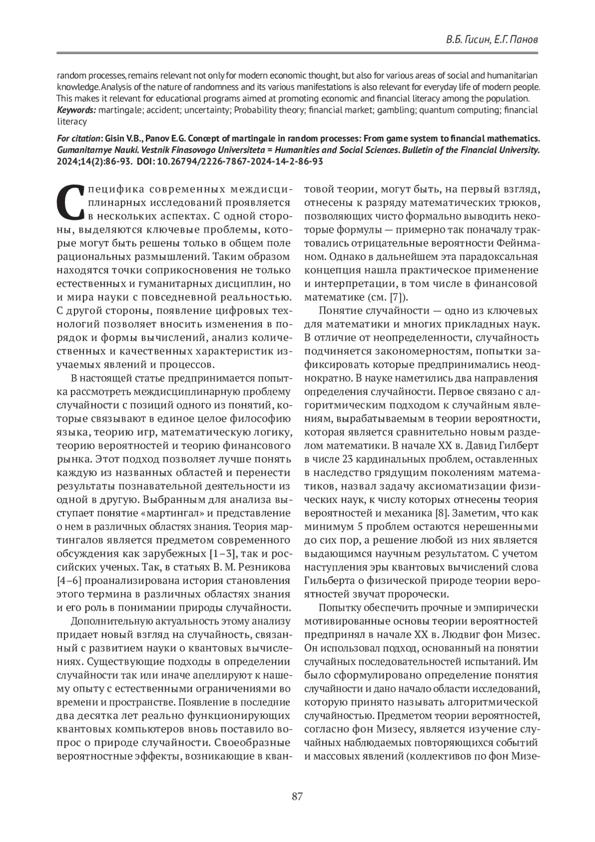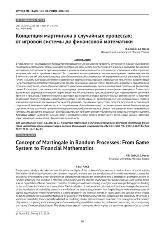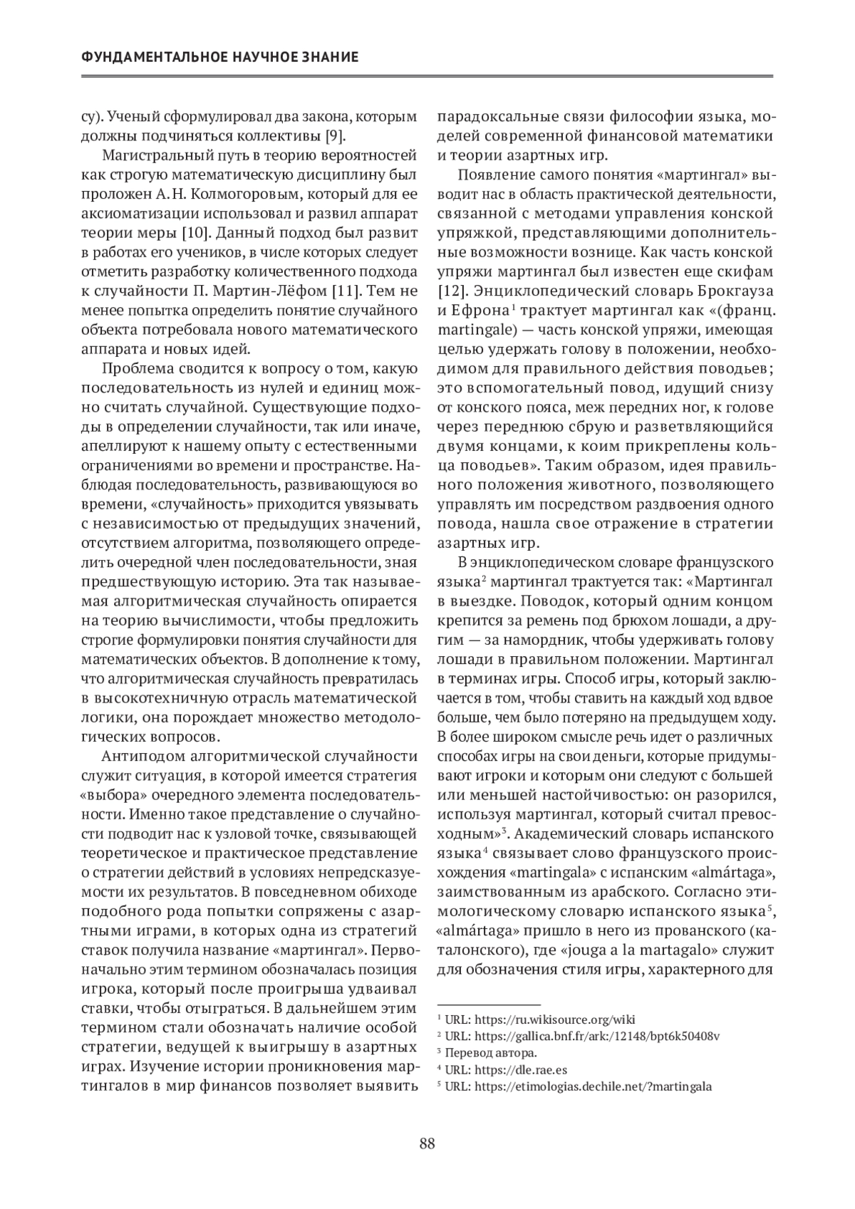 В предлагаемом исследовании проводится междисциплинарный анализ проблемы случайности в различных формах социальной деятельности. Авторы находят существенную взаимосвязь лингвистического анализа с выводами финансовой математики о возможности прогнозирования в условиях неопределенности, что реализует стремление найти стратегию выгодных действий в случайных процессах. Это стремление нашло отражение в смысловом содержании понятия «мартингал». В течение столетий оно использовалось для обозначения особых возможностей управления конной упряжью. Затем им начали называть выигрышные стратегии в различных азартных играх, ведущие к обогащению того, кто ими владеет. Введение в эти стратегии математических расчетов явилось одним из оснований теории вероятности. В середине прошлого века термином «мартингал» стали обозначать процесс накопления капитала при реализации торговой стратегии на финансовом рынке. В последние годы данное понятие характеризует вычисляемые стратегии игры на финансовым рынке. Это открыло возможности формирования версии теории вероятностей, специально приспособленной для моделирования рыночных явлений и процессов. Появление науки о квантовых вычислениях и новых вычислительных возможностей на практике возрождает проблему борьбы с неопределенностью с использованием средств современной цифровизации. Поэтому концепция мартингала как поиска возможностей управлять случайными процессами остается актуальной не только для современной экономической мысли, но и для различных областей социального и гуманитарного знания. Анализ природы случайности и ее различных проявлений оказывается востребованным также в области повседневной жизни современного человека. Это делает его актуальным для образовательных программ экономической и финансовой грамотности населения.