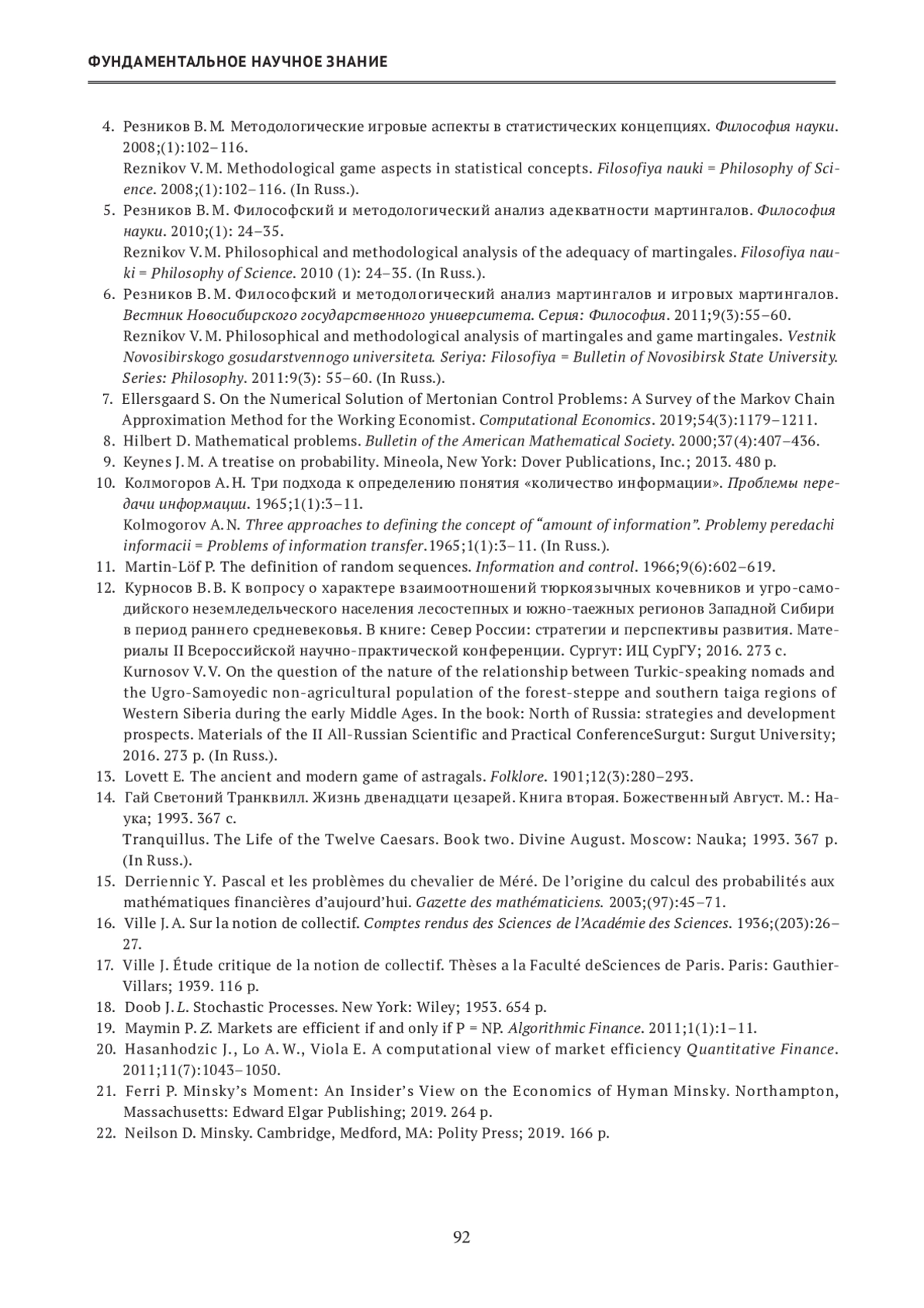 5. Резников В. М. Философский и методологический анализ адекватности мартингалов. Философия науки. 2010;(1): 24-35.