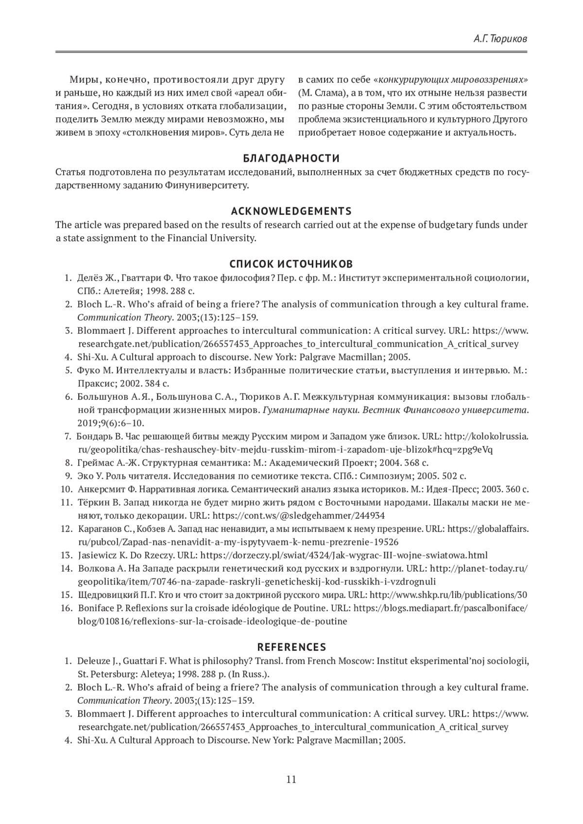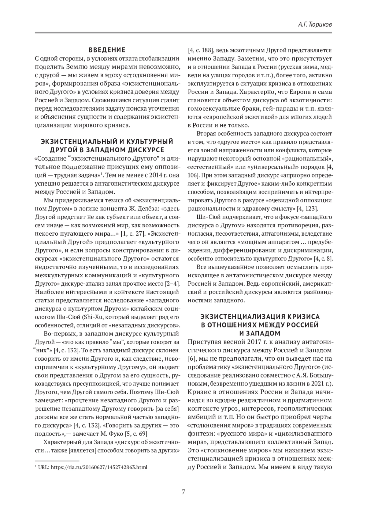 В статье на основе дискурсивного анализа описываются механизмы формирования образа «экзистенционального Другого» при наличии кризиса доверия между Россией и Западом. Анализируются зарубежные, восточные и отечественные подходы к экзистенциализации кризиса в отношениях между РФ и западными странами. В рамках этого выделены и описаны ключевые дискурсивные механизмы: надуманности, конструирования нарративных миров, введения в политическую, социокультурную и экономическую повестку «темных интенсиональных контекстов», а также механизм, направляющий дискурс в русло мифологик. Предложенный подход может быть использован в исследованиях экзистенциализации современного мирового кризиса.