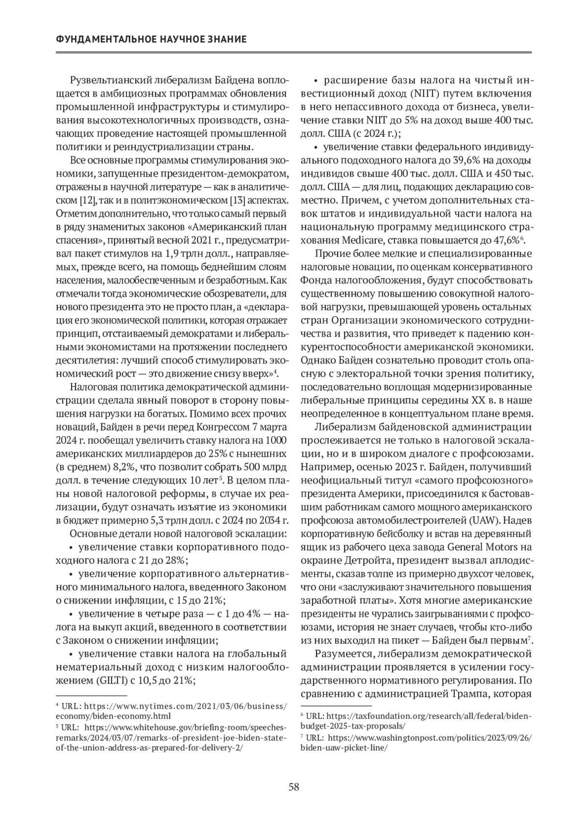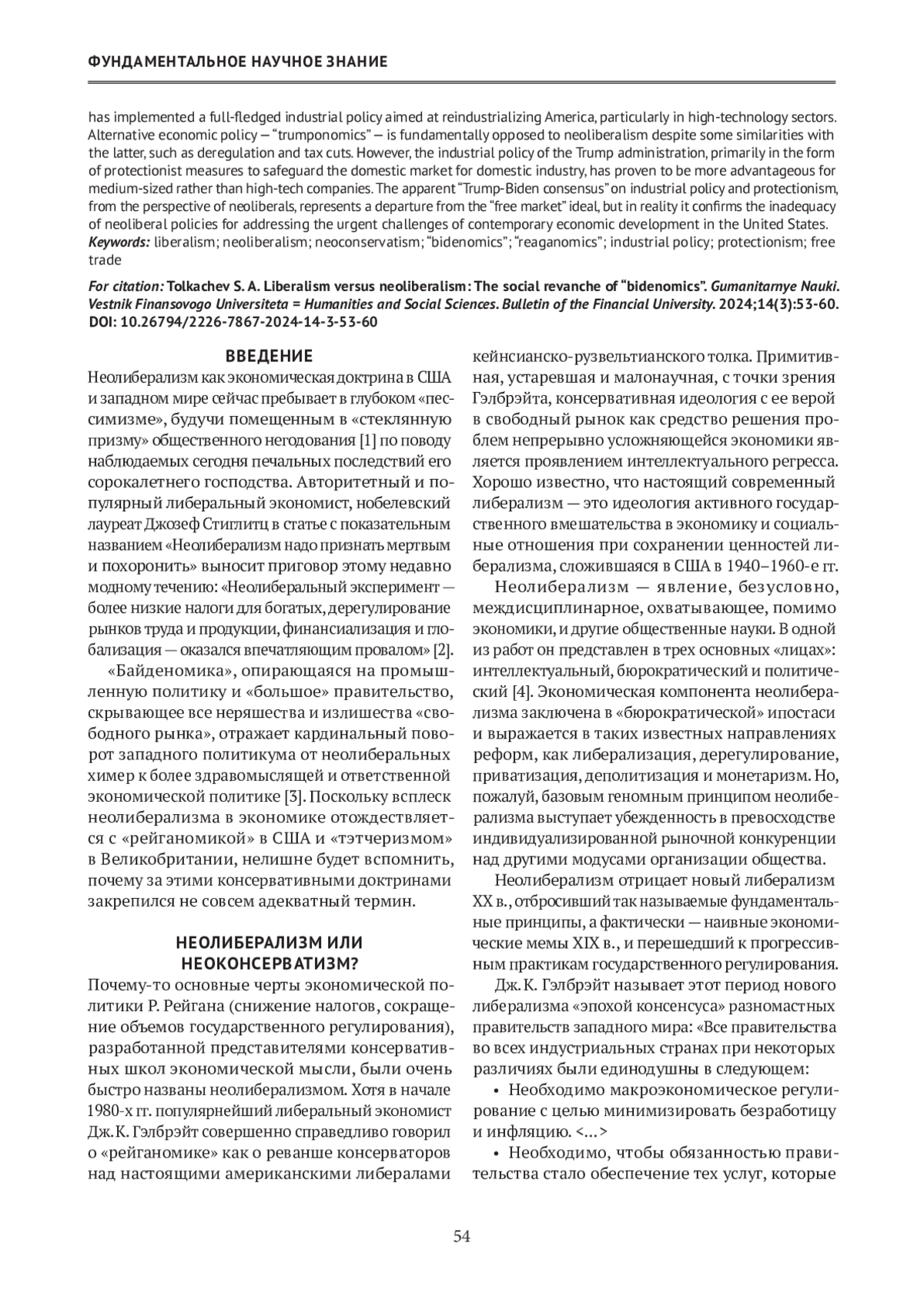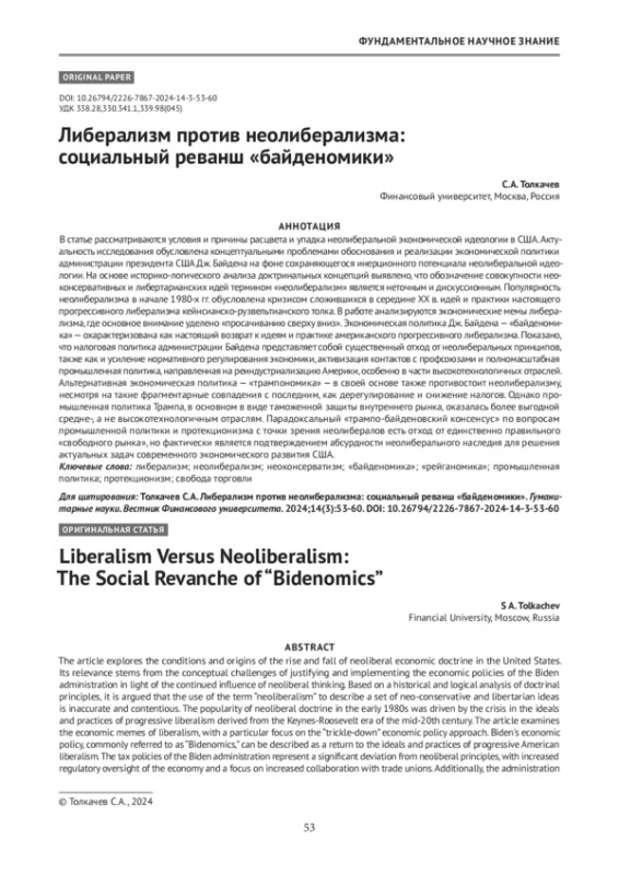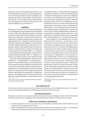 В статье рассматриваются условия и причины расцвета и упадка неолиберальной экономической идеологии в США. Актуальность исследования обусловлена концептуальными проблемами обоснования и реализации экономической политики администрации президента США Дж. Байдена на фоне сохраняющегося инерционного потенциала неолиберальной идеологии. На основе историко-логического анализа доктринальных концепций выявлено, что обозначение совокупности неоконсервативных и либертарианских идей термином «неолиберализм» является неточным и дискуссионным. Популярность неолиберализма в начале 1980-х гг. обусловлена кризисом сложившихся в середине XX в. идей и практики настоящего прогрессивного либерализма кейнсианско-рузвельтианского толка. В работе анализируются экономические мемы либерализма, где основное внимание уделено «просачиванию сверху вниз». Экономическая политика Дж. Байдена — « байденомика» — о характеризована как настоящий возврат к идеям и практике американского прогрессивного либерализма. Показано, что налоговая политика администрации Байдена представляет собой существенный отход от неолиберальных принципов, также как и усиление нормативного регулирования экономики, активизация контактов с профсоюзами и полномасштабная промышленная политика, направленная на реиндустриализацию Америки, особенно в части высокотехнологичных отраслей. Альтернативная экономическая политика — «трампономика» — в своей основе также противостоит неолиберализму, несмотря на такие фрагментарные совпадения с последним, как дерегулирование и снижение налогов. Однако промышленная политика Трампа, в основном в виде таможенной защиты внутреннего рынка, оказалась более выгодной средне-, а не высокотехнологичным отраслям. Парадоксальный «трампо-байденовский консенсус» по вопросам промышленной политики и протекционизма с точки зрения неолибералов есть отход от единственно правильного «свободного рынка», но фактически является подтверждением абсурдности неолиберального наследия для решения актуальных задач современного экономического развития США.